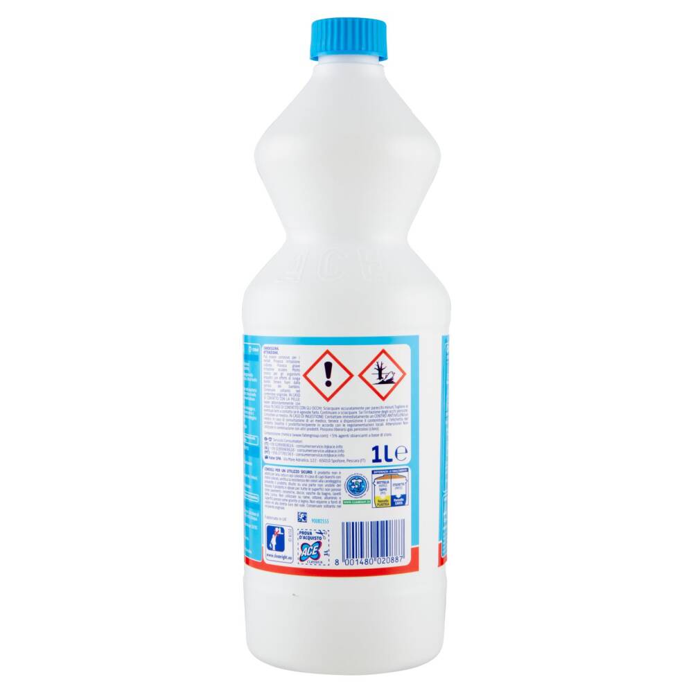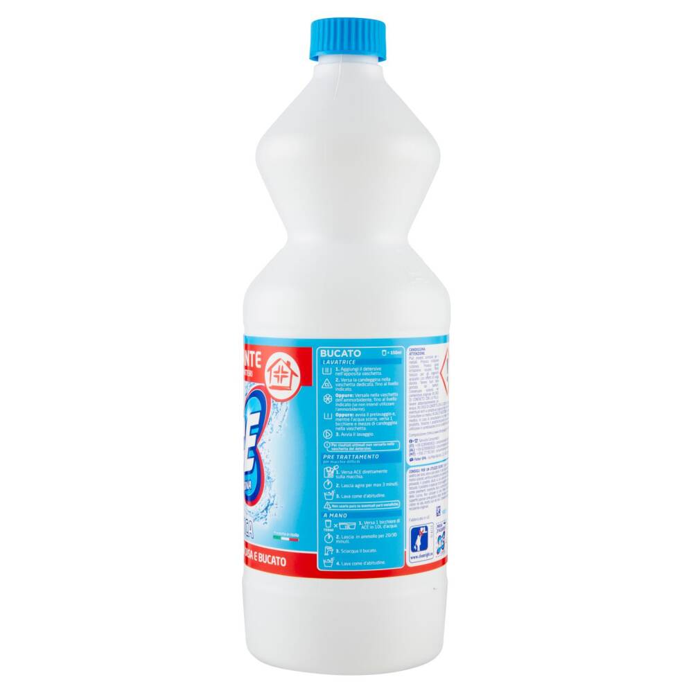 Consigli per un utilizzo sicuro: Il prodotto non è adatto per lana, seta e capi colorati. In caso di capi bianchi con motivi colorati, verifica la resistenza dei colori alla candeggina provando il prodotto diluito su una parte non visibile del tessuto. Il prodotto è ideale per tutte le superfici non porose come pavimenti, ceramiche, docce, vasche da bagno, lavelli della cucina. Non utilizzare su rame, ottone, alluminio e superfici porose come granito o legno. Non esporre a fonti di calore nè alla diretta luce del sole. Conservare soltanto nel recipiente originale.