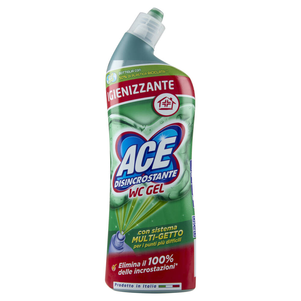 Ace WC Gel, grazie all'esclusivo sistema con 6 getti, igienizza il WC arrivando anche nei punti più difficili da raggiungere e garantendo una copertura uniforme e completa.