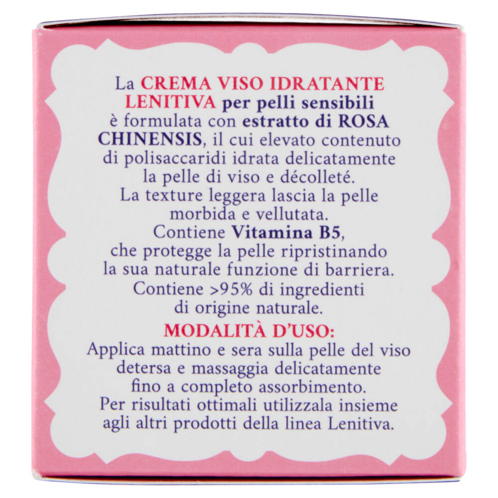 La Crema Viso Idratante Lenitiva per pelli sensibili è formulata con estratto di Rosa Chinensis, il cui elevato contenuto di polisaccaridi idrata delicatamente la pelle di viso e décolleté.