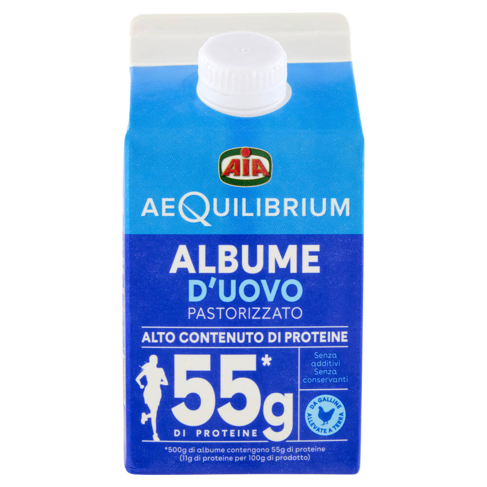 Alto contenuto di proteine 55*g di Proteine Senza additivi Senza conservanti Da galline allevate a terra *500g di albume contengono 55g di proteine (11g di proteine per 100g di prodotto)