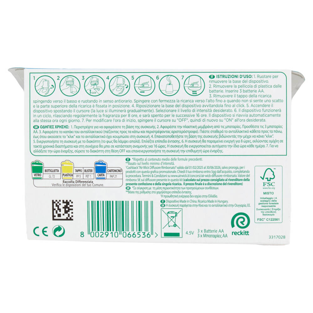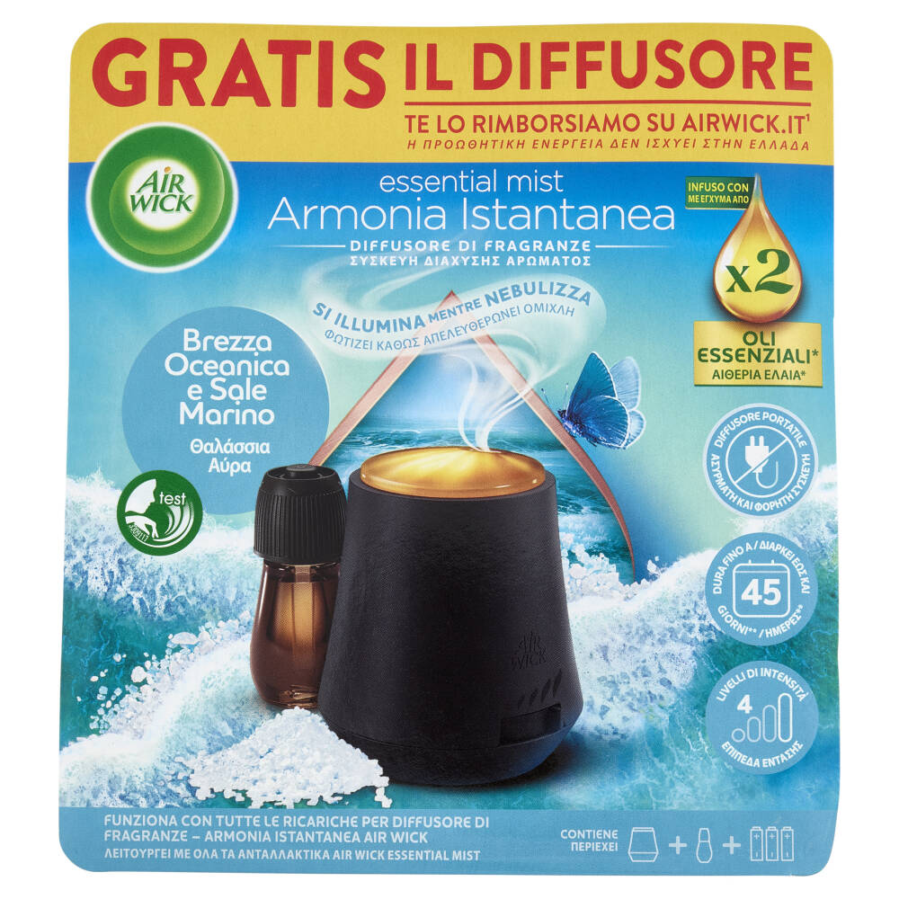 Essential mist Armonia Istantanea Infuso con x2 oli essenziali* Si illumina mentre nebullizza Diffusore portatile Dura fino a 45 giorni** Livelli di intensità 4 Funziona con tutte le ricariche per diffusore di fragranze - Armonia istantanea Air Wick *Rispetto al contenuto medio delle formule precedenti **Basato sul livello minimo d'intensità