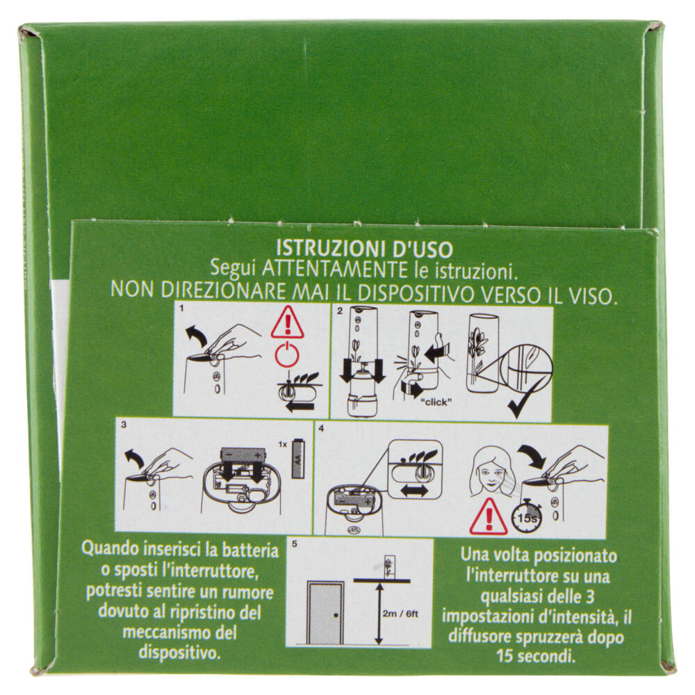 Una volta posizionato l'interruttore su una qualsiasi delle 3 impostazioni d'intensità, il diffusore spruzzerà dopo 15 secondi.