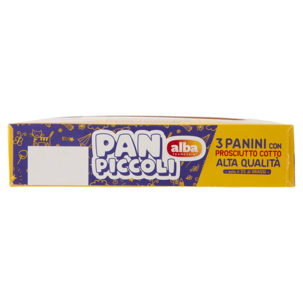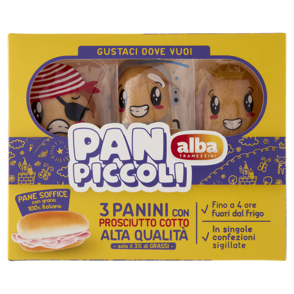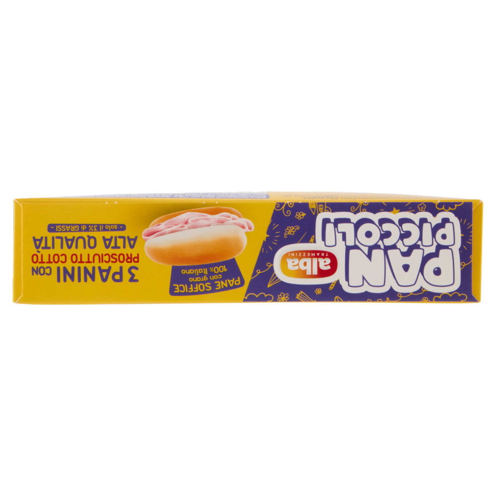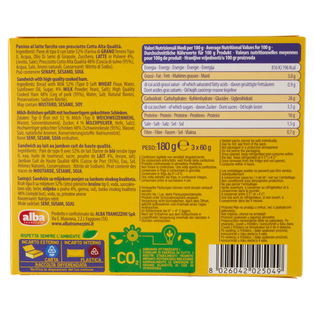 Pane di tipo 0 con latte 52% (farina di grano tenero tipo 0, acqua, olio di semi di girasole, zucchero, latte in polvere 4%, lievito, sale) Prosciutto cotto Alta Qualità 48% (coscia di suino (95%), acqua, sale, aromi naturali, conservanti: nitrito di sodio) Può contenere senape, sesamo, soia