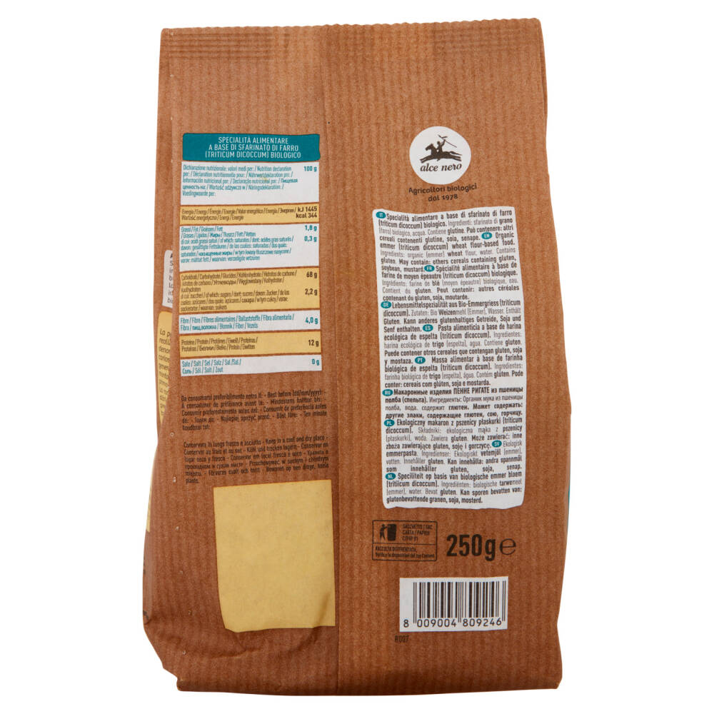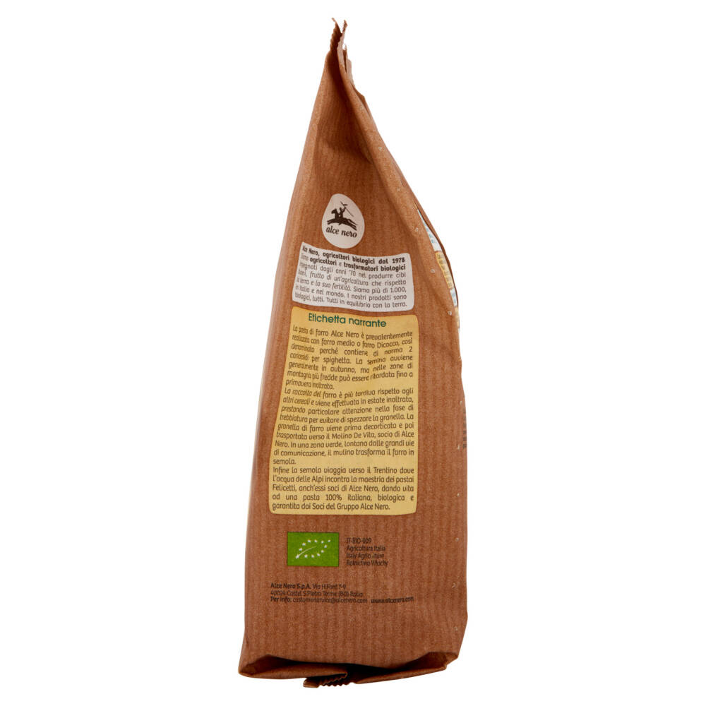 La pasta di farro Alce Nero è prevalentemente realizzata con farro medio o farro Dicocco, così denominato perché contiene di norma 2 cariossidi per spighetta. La semina avviene generalmente in autunno, ma nelle zone di montagna più fredde può essere ritardata fino a primavera inoltrata.