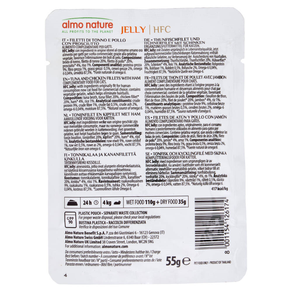 HFC Jelly: con ingredienti in origine idonei al consumo umano ora alimento per gatti per scelta commerciale; grazie alla gelatina vegetale, favorisce l'eliminazione dei boli di pelo.