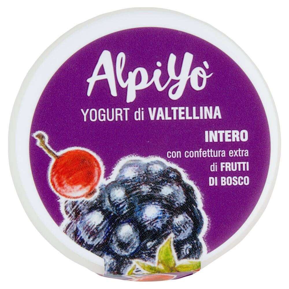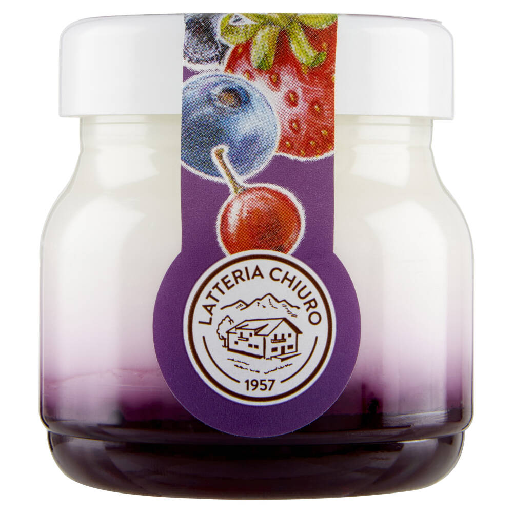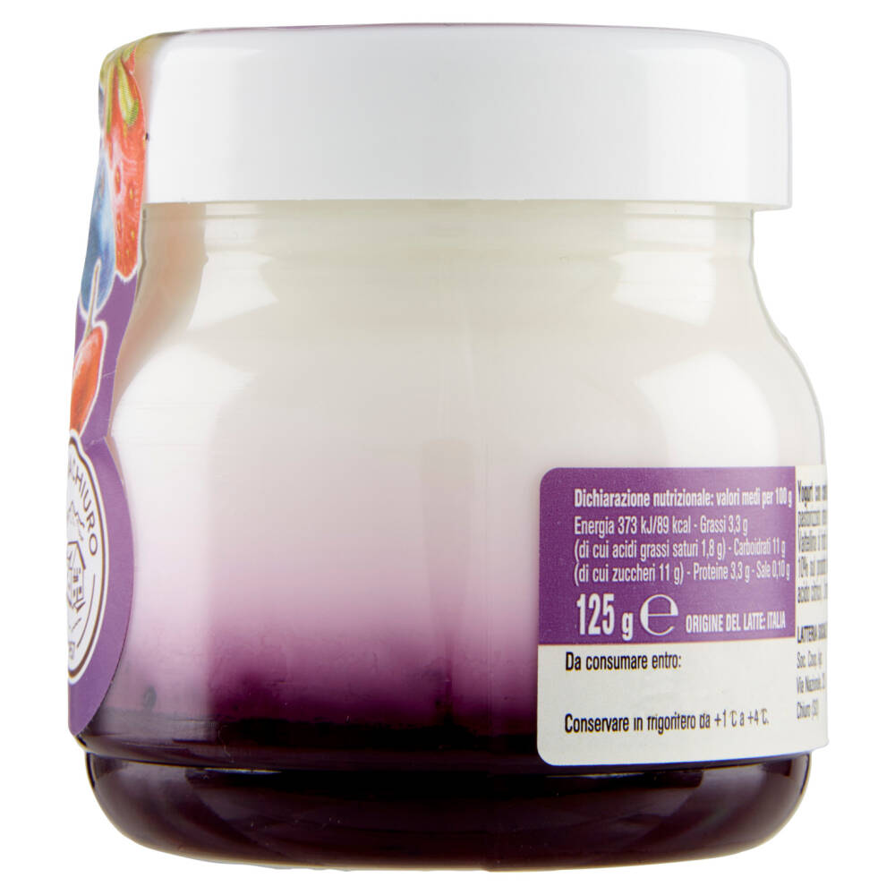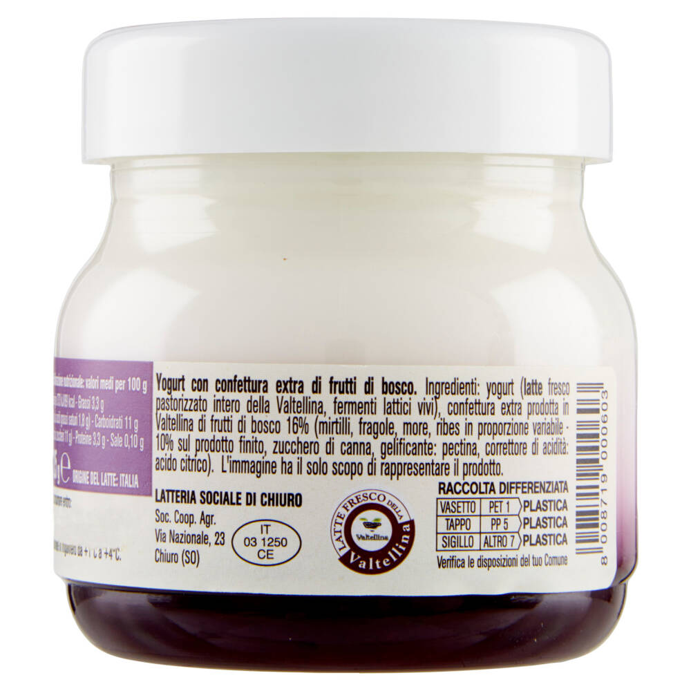 Yogurt (latte fresco pastorizzato intero della Valtellina, fermenti lattici vivi) Confettura extra prodotta in Valtellina di frutti di bosco 16% (mirtilli, fragole, more, ribes in proporzione variabile - 10% sul prodotto finito, zucchero di canna, gelificante: pectina, correttore di acidità: acido citrico)