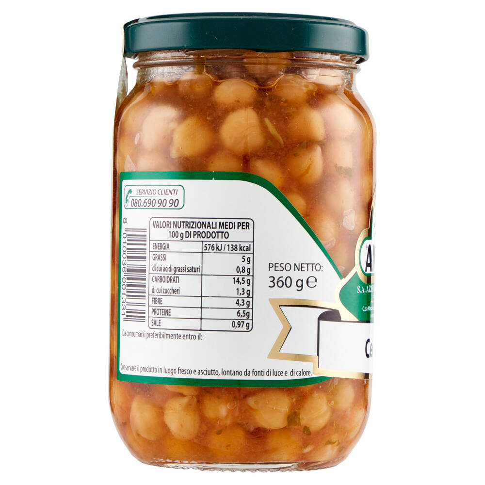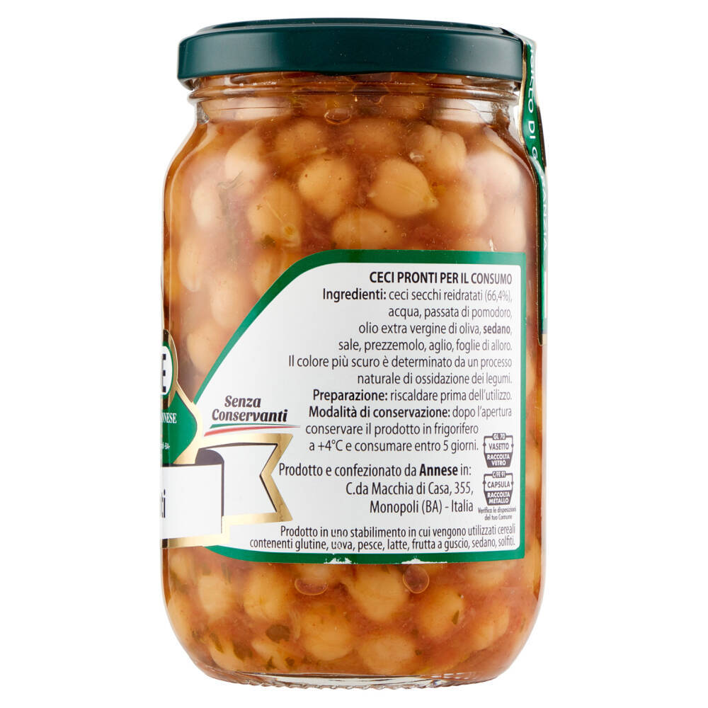 Ceci secchi reidratati (66,4%) Acqua Passata di pomodoro Olio extra vergine di oliva Sedano Sale Prezzemolo Aglio Foglie di alloro Prodotto in uno stabilimento in cui vengono utilizzati cereali contenenti glutine, uova, pesce, latte, frutta a guscio, sedano, solfiti