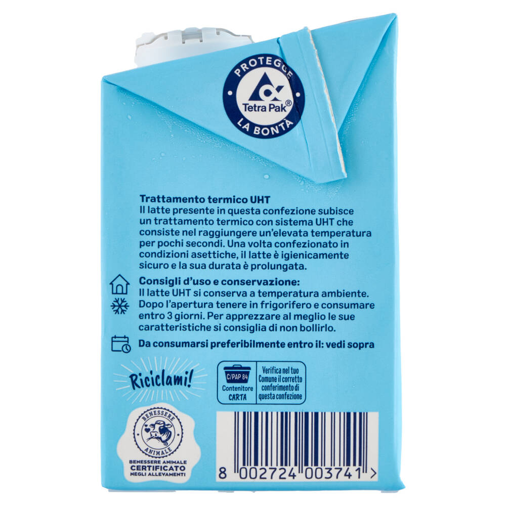 Il latte presente in questa confezione subisce un trattamento termico con sistema UHT che consiste nel raggiungere un'elevata temperatura per pochi secondi. Una volta confezionato in condizioni asettiche, il latte è igienicamente sicuro e la sua durata è prolungata.