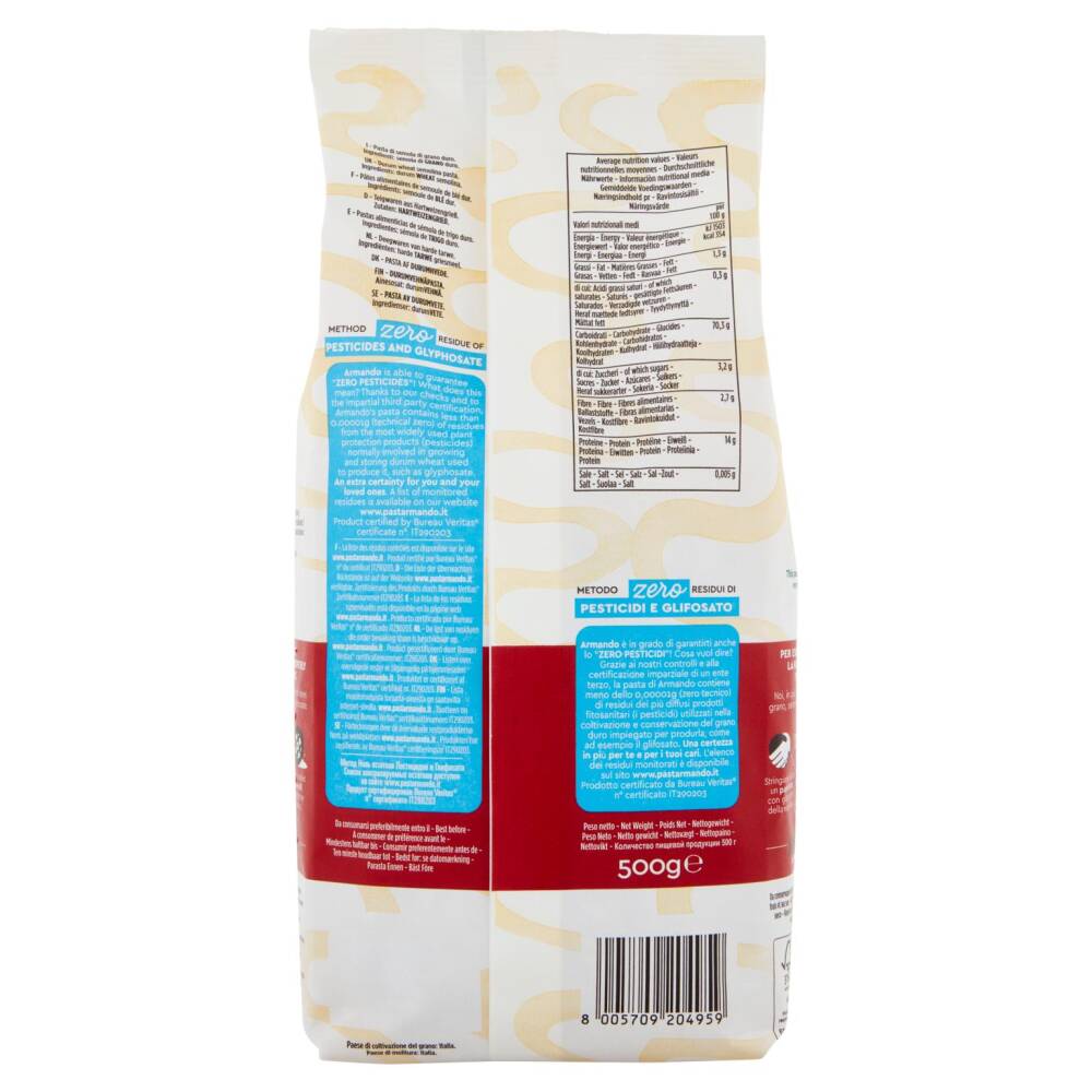 Armando è in grado di garantirti anche lo "Zero Pesticidi"! Cosa vuol dire? Grazie ai nostri controlli e alla certificazione imparziale di un ente terzo, la pasta di Armando contiene meno dello 0,00001g (zero tecnico) di residui dei più diffusi prodotti fitosanitari (i pesticidi) utilizzati nella coltivazione e conservazione del grano duro impiegato per produrla, come ad esempio il glifosato. Una certezza in più per te e per i tuoi cari. L'elenco dei residui monitorati è disponibile sul sito www.pastarmando.it