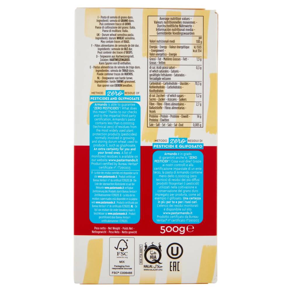 Armando è in grado di garantirti anche lo "Zero Pesticidi"! Cosa vuol dire? Grazie ai nostri controlli e alla certificazione imparziale di un ente terzo, la pasta di Armando contiene meno dello 0,00001g (zero tecnico) di residui dei più diffusi prodotti fitosanitari (i pesticidi) utilizzati nella coltivazione e conservazione del grano duro impiegato per produrla, come ad esempio il glifosato. Una certezza in più per te e per i tuoi cari. L'elenco dei residui monitorati è disponibile sul sito www.pastarmando.it