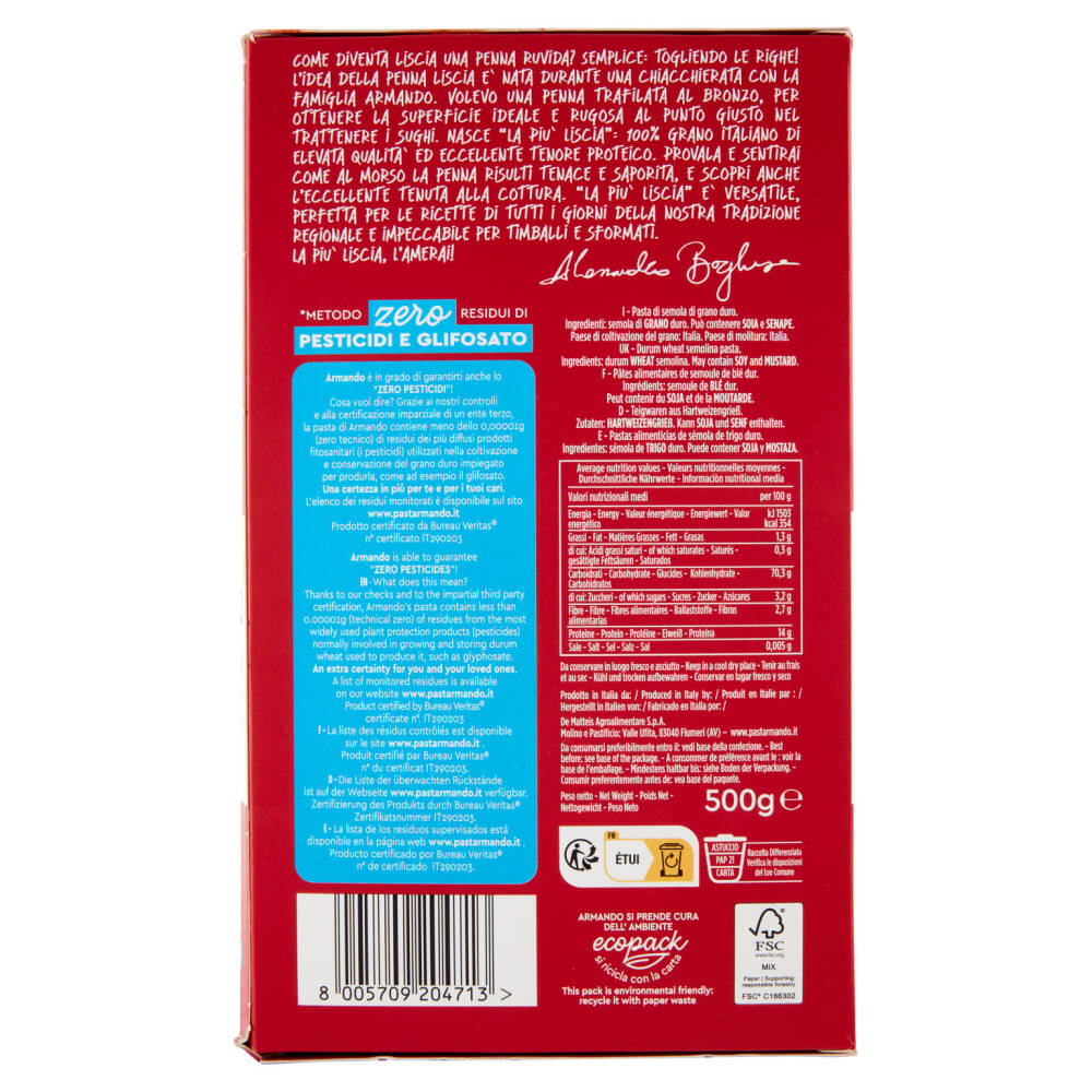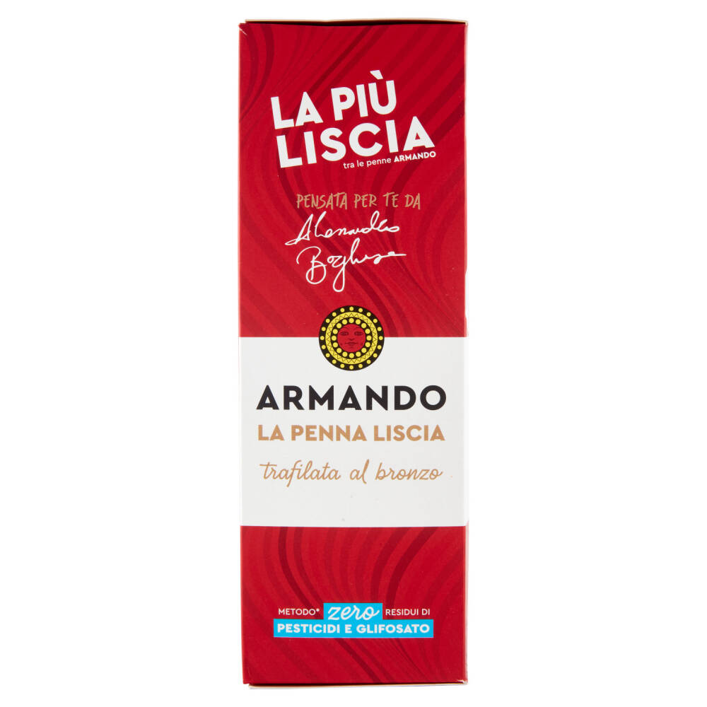 Come diventa liscia una penna ruvida? Semplice: togliendo le righe! L'idea della penna liscia è nata durante una chiacchierata con la famiglia Armando. Volevo una penna trafilata al bronzo, per ottenere la superficie ideale e rugosa al punto giusto nel trattenere i sughi. Nasce ''la più liscia'': 100% grano italiano di elevata qualità ed eccellente tenore proteico. Provala e sentirai come al morso la penna risulti tenace e saporita, e scopri anche l'eccellente tenuta alla cottura. ''La più liscia'' è versatile, perfetta per le ricette di tutti i giorni della nostra tradizione regionale e impeccabile per timballi e sformati.