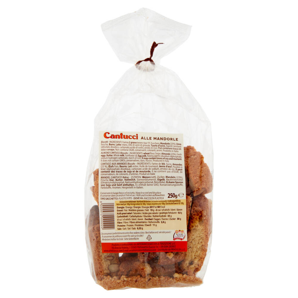 Farina di grano tenero tipo "0" Zucchero Mandorle (23%) Uova fresche Burro Latte intero Olio di semi di girasole Tuorlo d'uovo Agenti lievitanti (difosfato disodico, carbonato acido di sodio, amido di riso) Può contenere tracce di: soia e senape Non contiene OGM, conservanti, coloranti, aromi