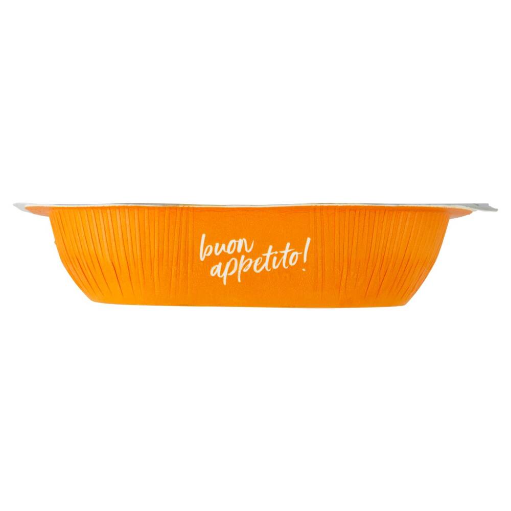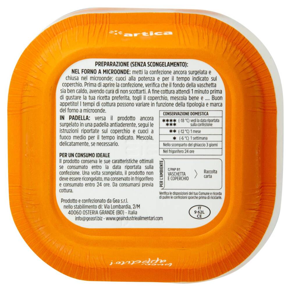 Salsa allo zafferano 52% [besciamella (acqua, latte in polvere, amido modificato, siero di latte, fibra alimentare, sale), panna (latte), Grana Padano DOP (latte, sale, caglio animale, conservante: lisozima proteina dell'uovo), burro (latte), cipolla, sale, vino bianco (solfiti), estratto di carne, zafferano 0,02%, prezzemolo, basilico]