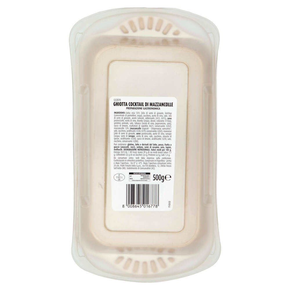 Salsa rosa 55% [olio di semi di girasole, ketchup (concentrato di pomodoro, acqua, zucchero, aceto di vino, sale, olio di semi di girasole, aromi naturali, addensanti: E412, E415), uovo pastorizzato, aceto di vino, Brandy (acqua, alcool, colorante: E150a), gelatina animale, sale, tabasco (aceto di vino, peperoncino, sale), succo di limone, esaltatore di sapidità: E621; conservante: E202]