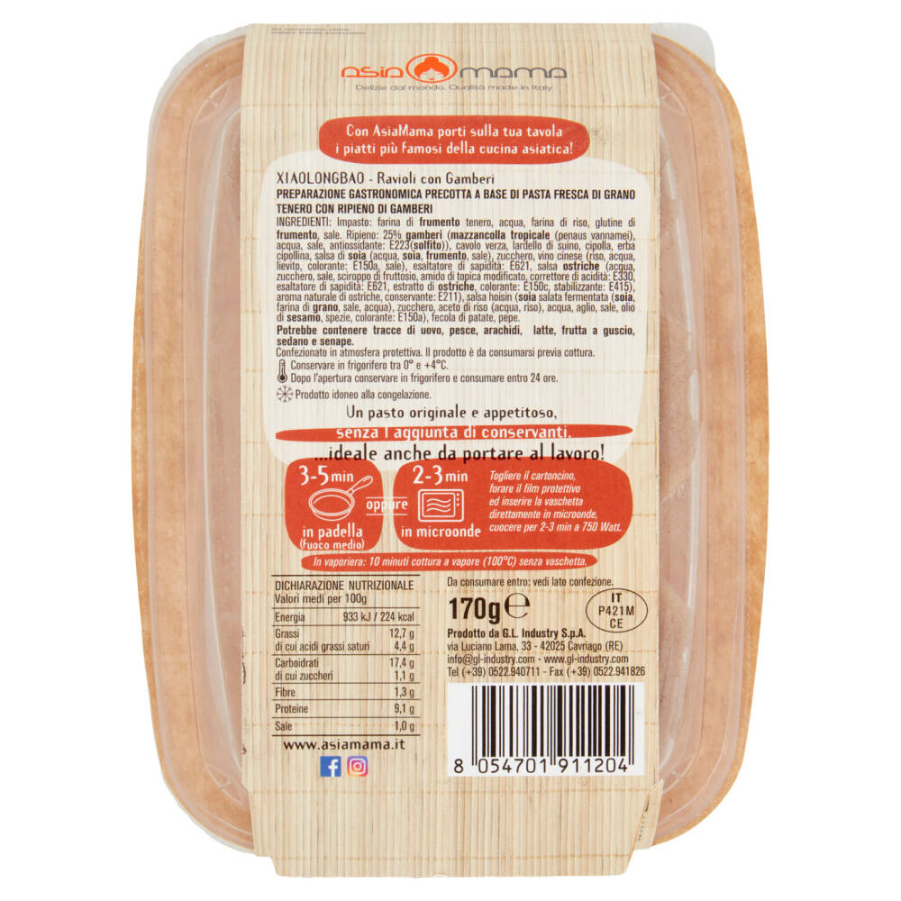 Ripieno: 25% gamberi (mazzancolla tropicale (penaus vannamei), acqua, sale, antiossidante: E223(solfito)), cavolo verza, lardello di suino, cipolla, erba cipollina, salsa di soia (acqua, soia, frumento, sale), zucchero, vino cinese (riso, acqua, lievito, colorante: E150a, sale), esaltatore di sapidità: E621, salsa ostriche (acqua, zucchero, sale, sciroppo di fruttosio, amido di topica modificato, correttore di acidità: E330, esaltatore di sapidità: E621, estratto di ostriche, colorante: E150c, stabilizzante: E415), aroma naturale di ostriche, conservante: E211), salsa hoisin (soia salata fermentata (soia, farina di grano, sale, acqua), zucchero, aceto di riso (acqua, riso), acqua, aglio, sale, olio di sesamo, spezie, colorante: E150a), fecola di patate, pepe
