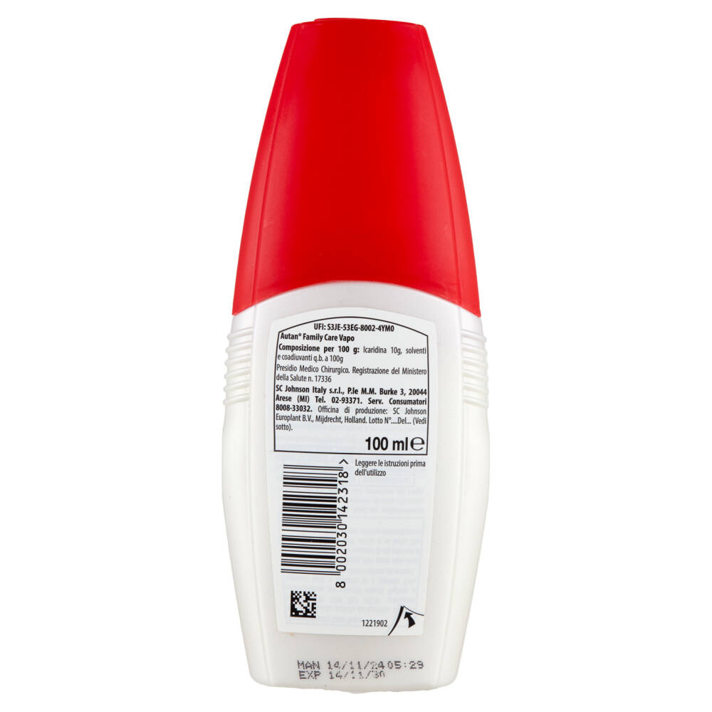 Autan Family Care Vapo è l'insetto-repellente che difende da punture di zanzare notturne, diurne e altri insetti molesti. Autan Family Care Vapo forma sulla pelle una barriera impenetrabile agli insetti molesti per 3/4 ore.
