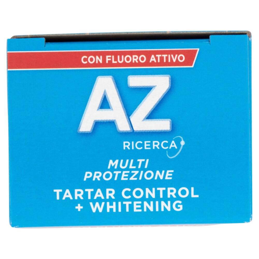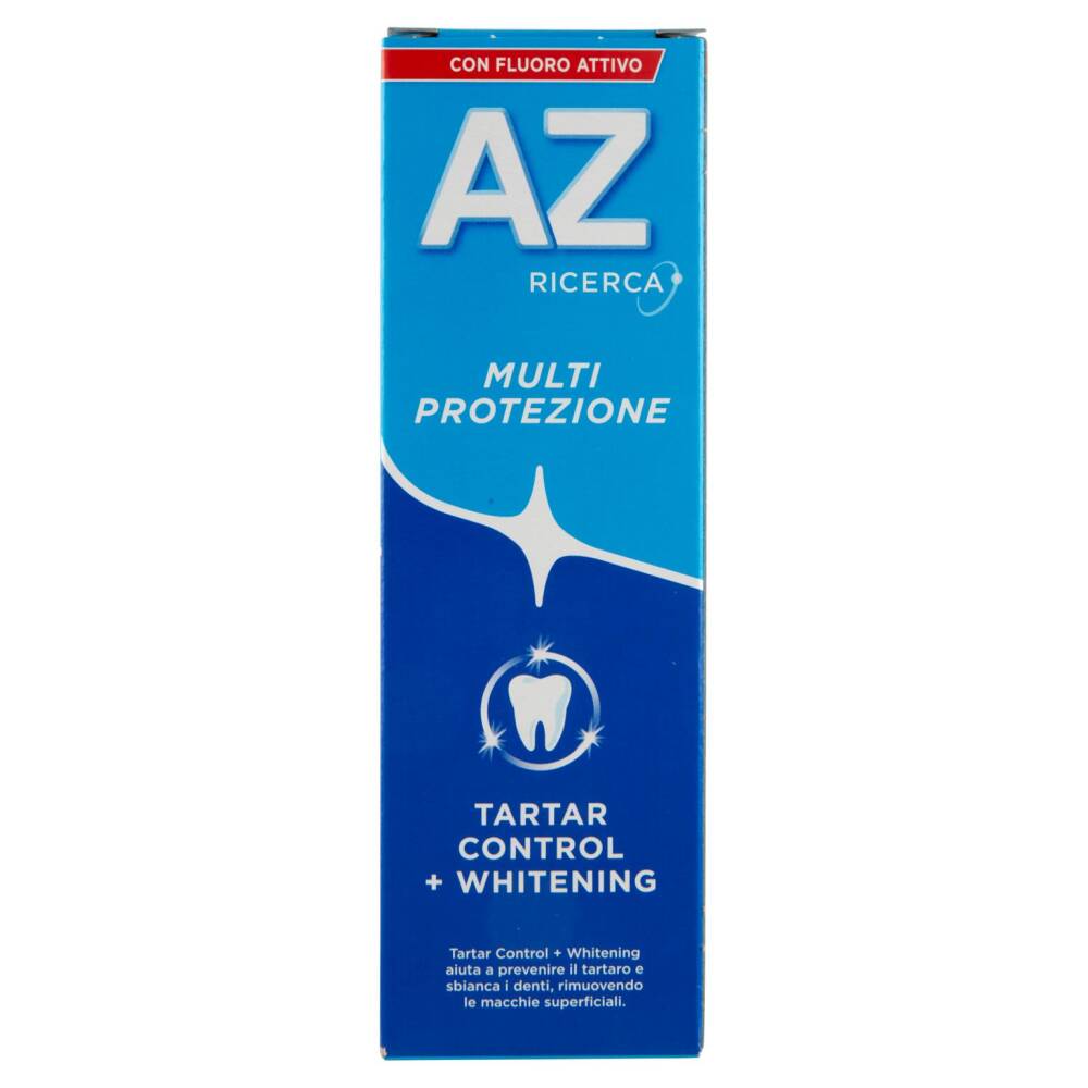 Il dentifricio AZ Multi-Protezione Tartar Control + Whitening per denti più bianchi rimuovendo le macchie superficiali.