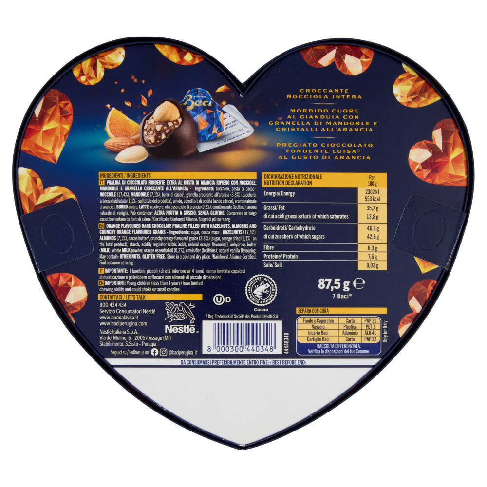 Zucchero Pasta di cacao¹ Nocciole (17,4%) Mandorle (7,1%) Burro di cacao¹ Granella croccante all'arancia (3,8%) [zucchero, arancia disidratata (1,1% - sul totale del prodotto), amido, correttore di acidità (acido citrico), aroma naturale di arancia] Burro anidro Latte in polvere Olio essenziale di arancia (0,2%) Emulsionante (lecitine) Aroma naturale di vaniglia Può contenere: altra frutta a guscio Senza glutine ¹Certificato Rainforest Alliance. Scopri di più su ra.org