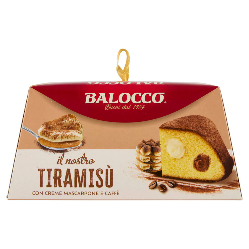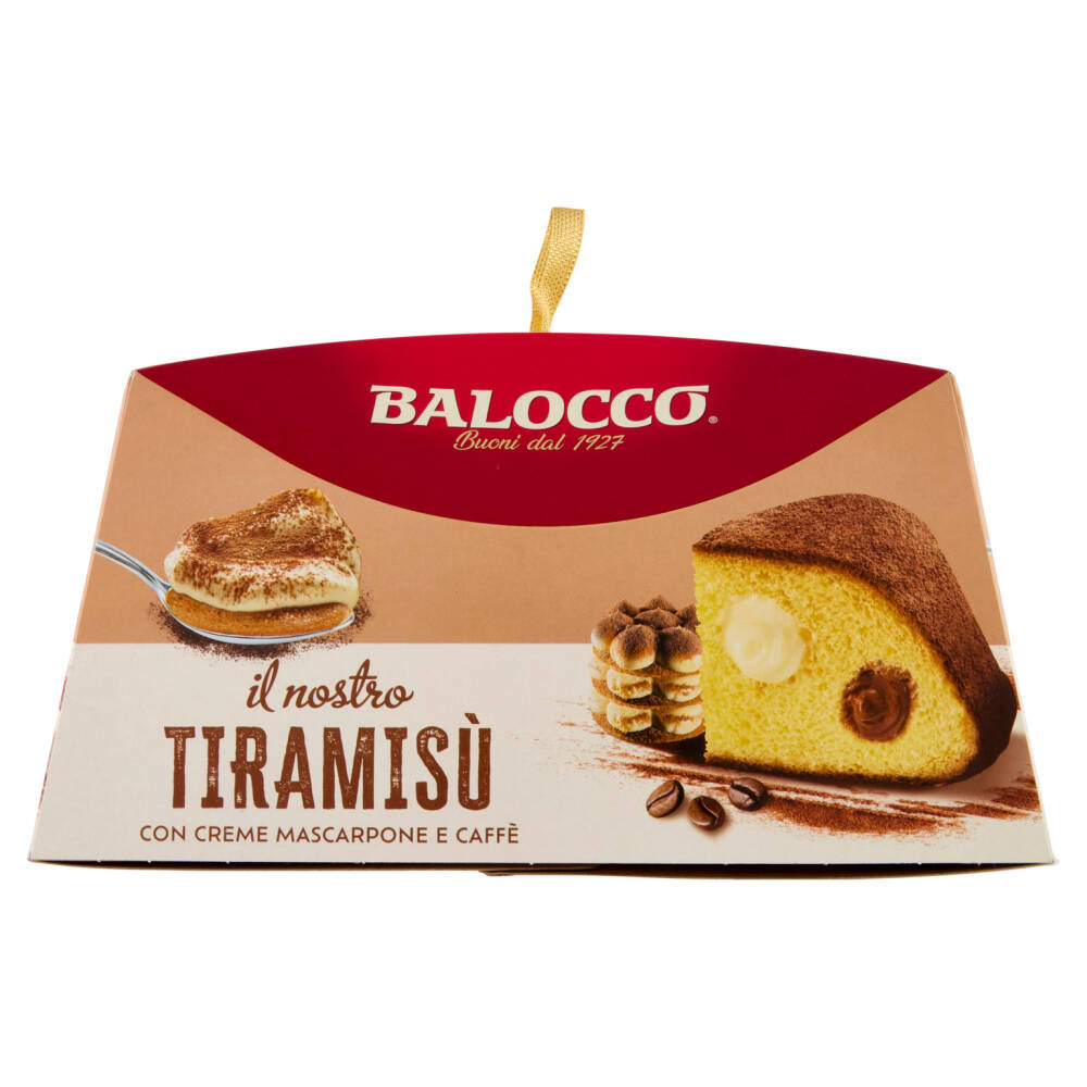 Prodotto dolciario da forno a lievitazione naturale farcito con creme mascarpone e caffè, con bustina di preparato al cacao magro zuccherato per decorazione