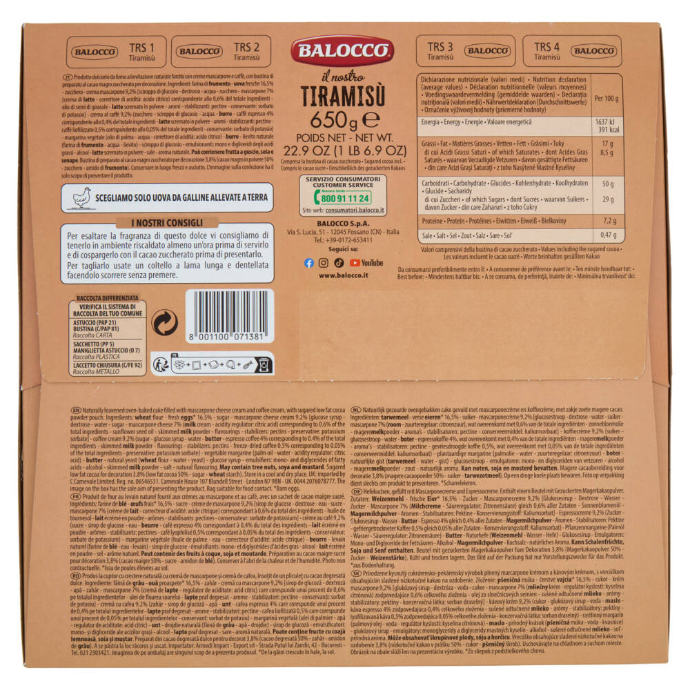 Farina di frumento Uova fresche 16,5% Zucchero Crema mascarpone 9,2% [sciroppo di glucosio - destrosio - acqua - zucchero - mascarpone 7% (crema di latte - correttore di acidità: acido citrico) corrispondente allo 0,6% del totale ingredienti - olio di semi di girasole - latte scremato in polvere - aromi - stabilizzanti: pectine - conservante: sorbato di potassio] Crema al caffè 9,2% (zucchero - sciroppo di glucosio - acqua - burro - caffè espresso 4% corrispondente allo 0,4% del totale ingredienti - latte scremato in polvere - aromi - stabilizzanti: pectine - caffè liofilizzato 0,5% corrispondente allo 0,05% del totale ingredienti - conservante: sorbato di potassio) Margarina vegetale (olio di palma, acqua, correttore di acidità: acido citrico) Burro Lievito naturale (farina di frumento - acqua - lievito) Sciroppo di glucosio Emulsionanti: mono e digliceridi degli acidi grassi Alcool Latte scremato in polvere Sale Aroma naturale Può contenere frutta a guscio, soia e senape Bustina di preparato al cacao magro zuccherato per decorazione 3,8% (cacao magro in polvere 50% - zucchero - amido di frumento)