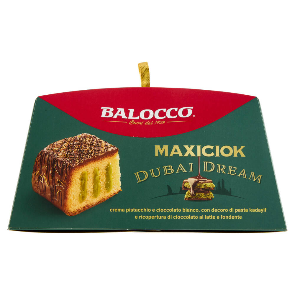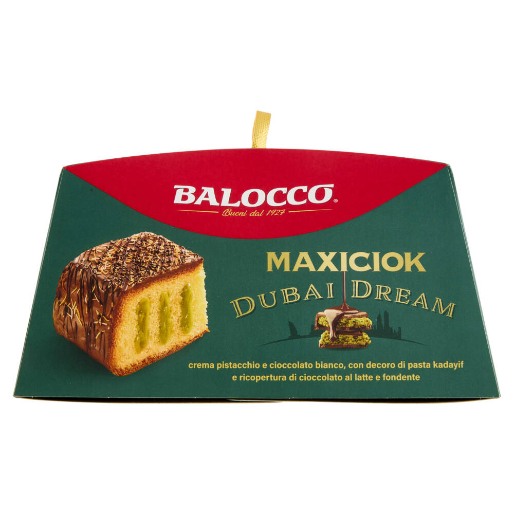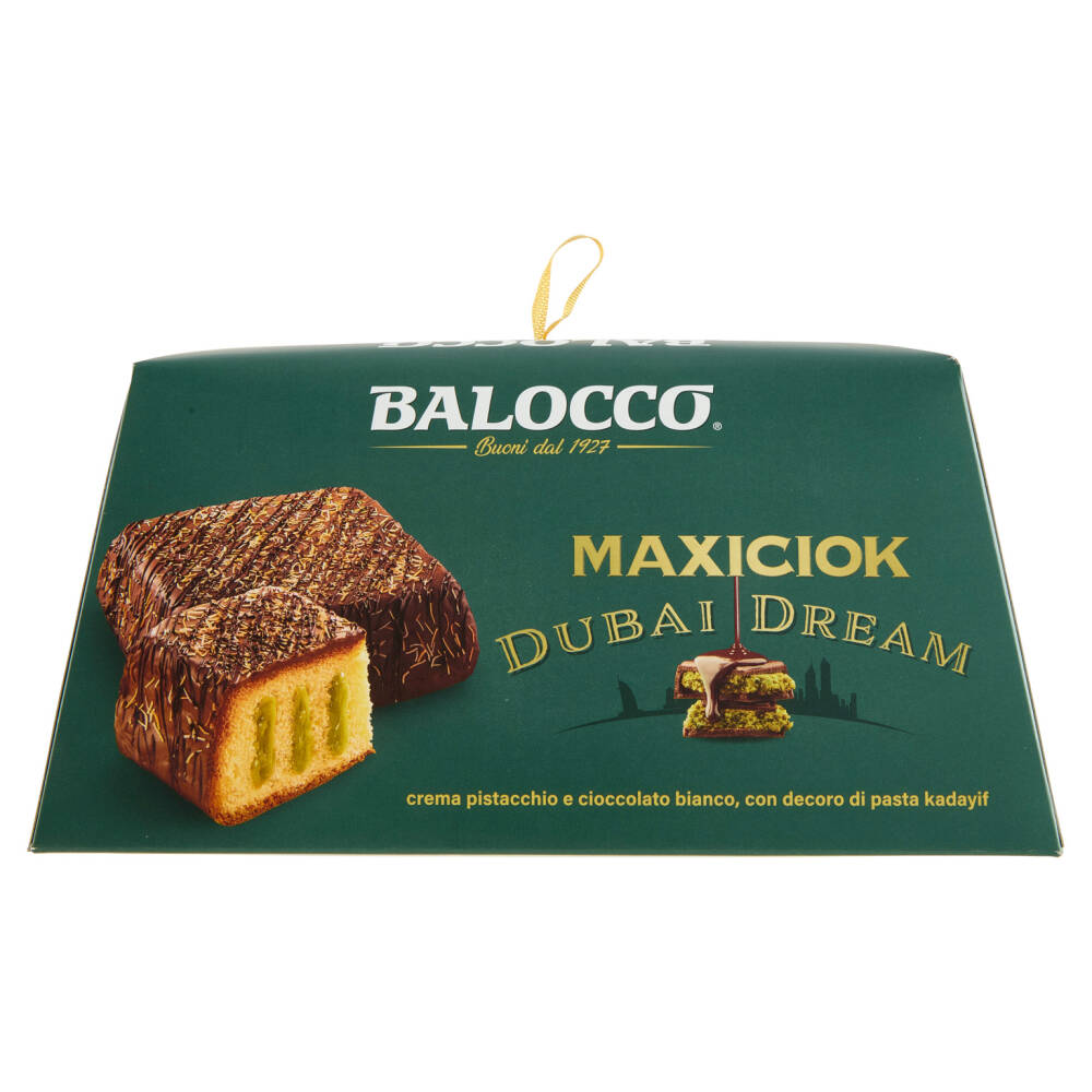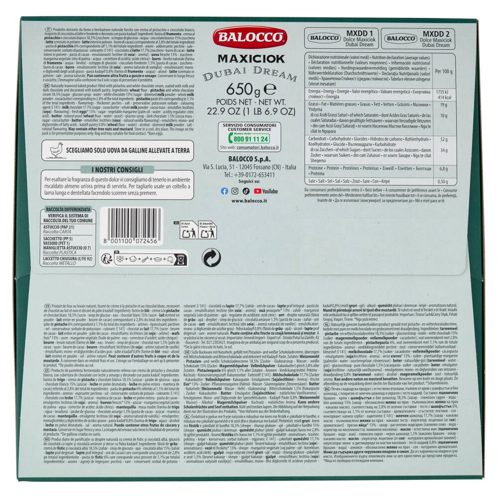 Farina di frumento Crema al pistacchio e cioccolato bianco 18,5% [zucchero - sciroppo di glucosio - acqua - cioccolato bianco 15% (zucchero - latte scremato in polvere - latte intero in polvere - burro di cacao) corrispondente al 2,8% del totale ingredienti - pasta di pistacchio 6% corrispondente all'1,1% del totale ingredienti - aromi - addensante: pectine - sale - conservante: sorbato di potassio - colorante: E141] Cioccolato al latte 17,7% [zucchero - burro di cacao - latte intero in polvere - pasta di cacao - emulsionanti: lecitine (di soia) - aroma] Uova fresche 13% Zucchero Margarina vegetale (olio di palma - acqua - correttore di acidità: acido citrico) Burro Lievito naturale (farina di frumento - acqua - lievito) Sciroppo di glucosio Cioccolato fondente 1,5% [pasta di cacao - zucchero - burro di cacao - burro - emulsionante: lecitine (di soia) - aroma naturale di vaniglia] Emulsionanti: mono- e digliceridi degli acidi grassi Pasta kadayif 0,8% (farina di frumento - acqua) Alcool Latte scremato in polvere Sale Aroma naturale Può contenere altra frutta a guscio e senape