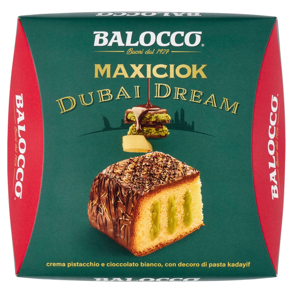 Prodotto dolciario da forno a lievitazione naturale farcito con crema al pistacchio e cioccolato bianco, ricoperto di cioccolato al latte e fondente e decorato con pasta kadayif