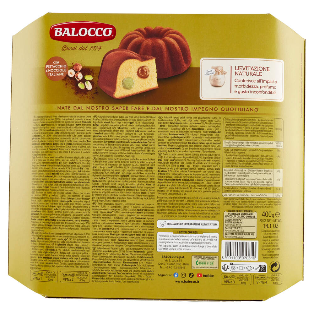 Prodotto dolciario da forno a lievitazione naturale farcito con creme pistacchio (8,8%) e nocciola (8,8%), con bustina di preparato al cacao magro zuccherato per decorazione (2,5%)