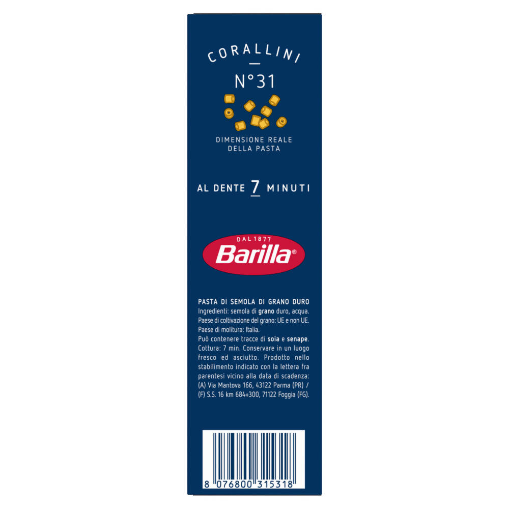 Barilla G. e R. Fratelli - Società per Azioni Via Mantova, 166 43122 Parma Italia Prodotto nello stabilimento indicato con la lettera fra parentesi vicino alla data di scadenza: (A) Via Mantova 166, 43122 Parma (PR) (F) S.S. 16 km 684+300, 71122 Foggia (FG)