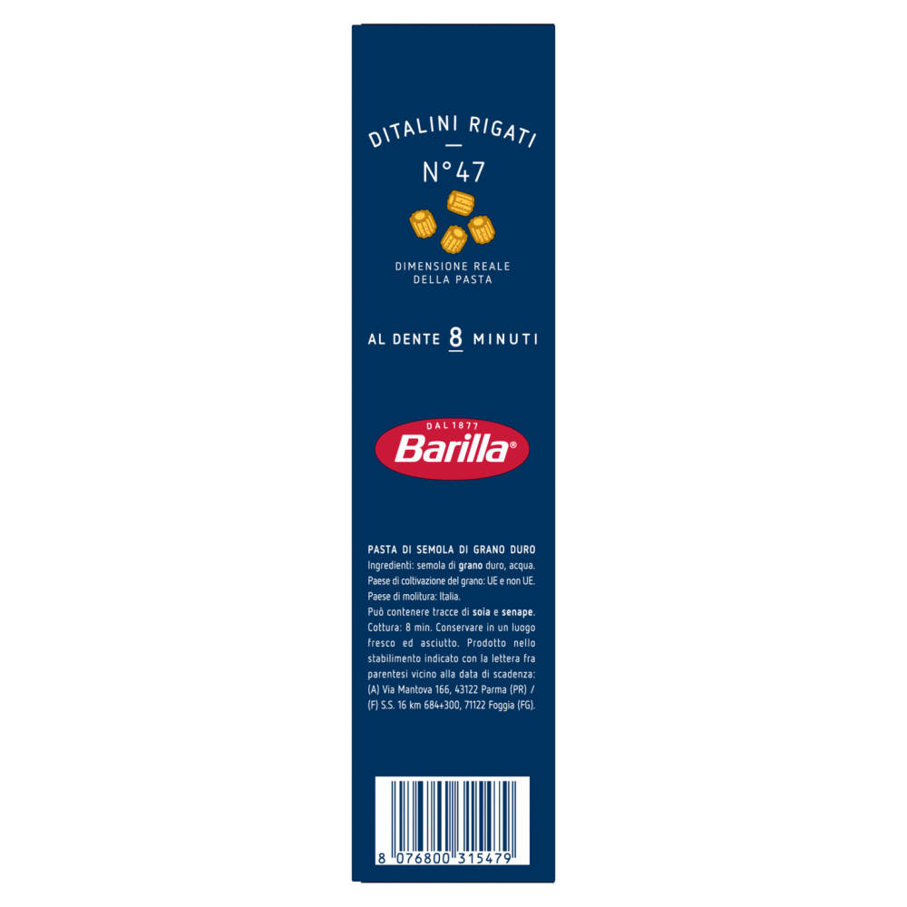 Barilla G. e R. Fratelli - Società per Azioni Via Mantova, 166 43122 Parma Italia Prodotto nello stabilimento indicato con la lettera fra parentesi vicino alla data di scadenza: (A) Via Mantova 166, 43122 Parma (PR) (F) S.S. 16 km 684+300, 71122 Foggia (FG)