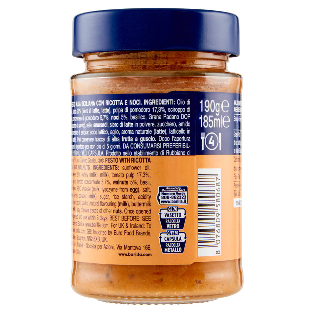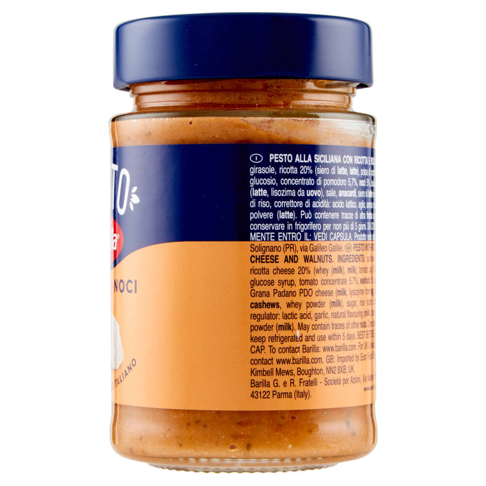 Olio di girasole Ricotta 20% (siero di latte, latte) Polpa di pomodoro 17,3% Sciroppo di glucosio Concentrato di pomodoro 5,7% Noci 5% Basilico Grana Padano DOP (latte, lisozima da uovo) Sale Anacardi Siero di latte in polvere Zucchero Amido di riso Correttore di acidità: acido lattico Aglio Aroma naturale (latte) Latticello in polvere (latte) Può contenere tracce di altra frutta a guscio