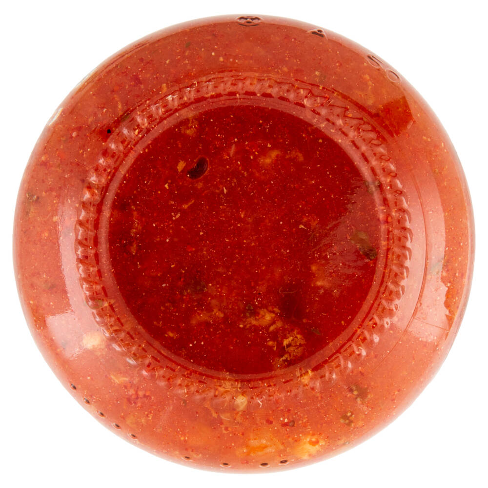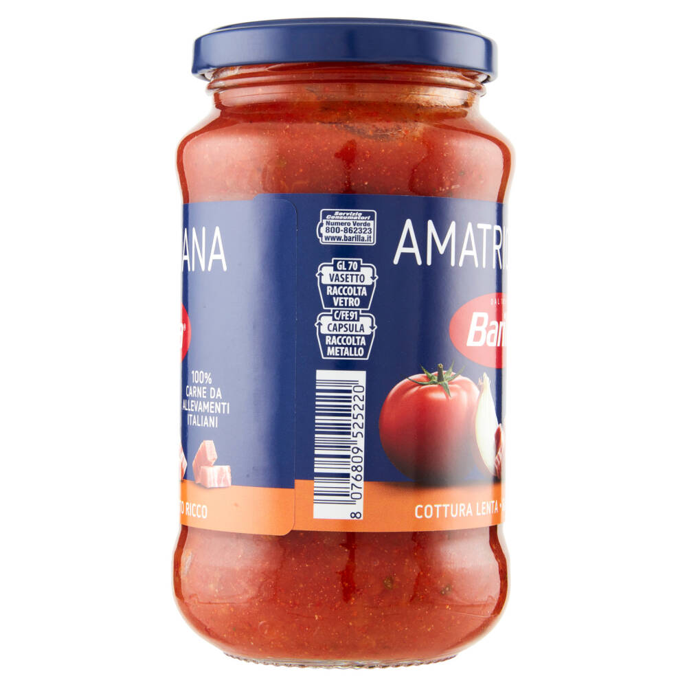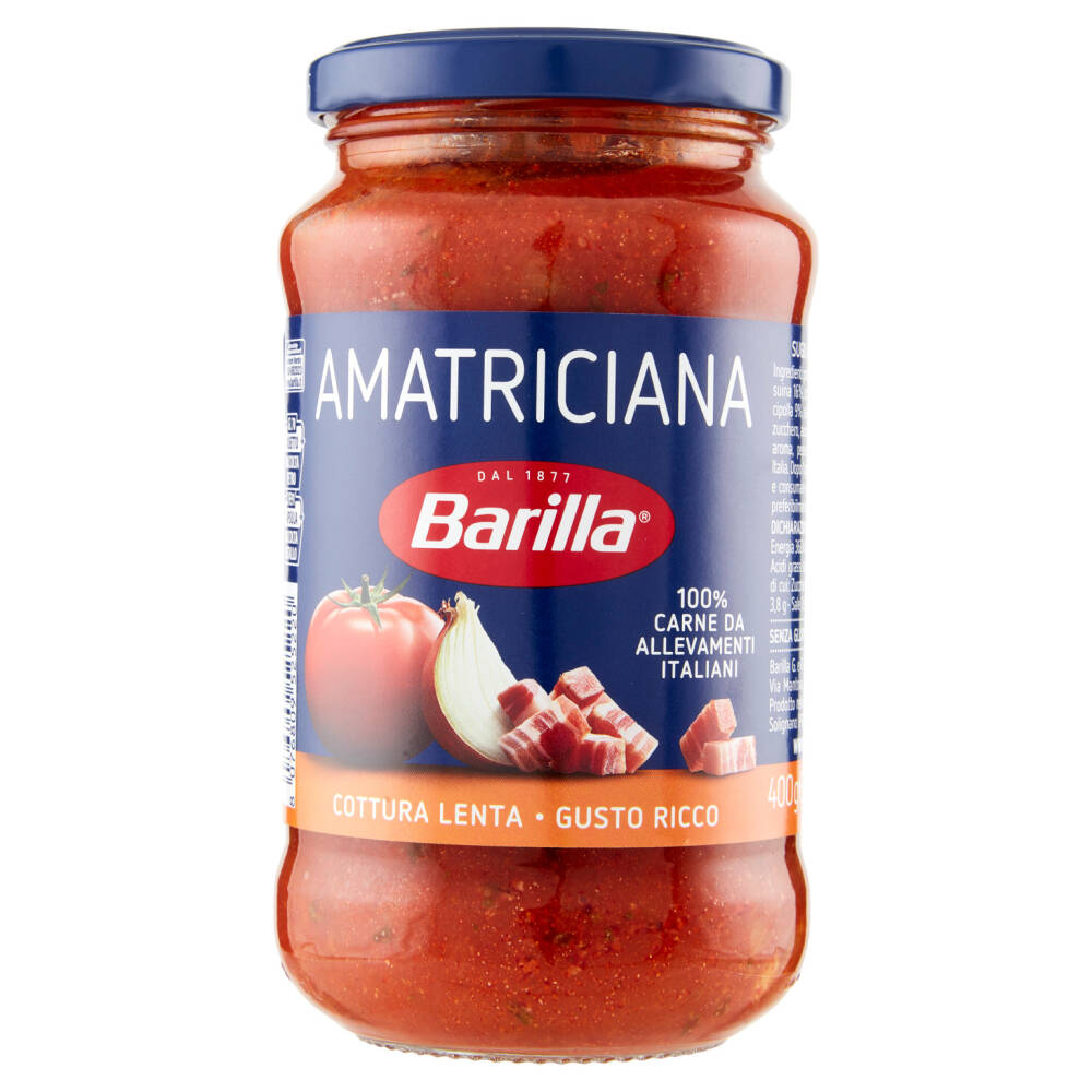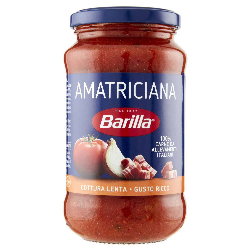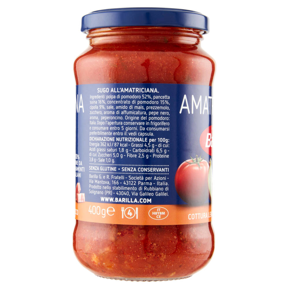 Polpa di pomodoro 52% Pancetta suina 16% Concentrato di pomodoro 15% Cipolla 9% Sale Amido di mais Prezzemolo Zucchero Aroma di affumicatura Pepe nero Aroma Peperoncino