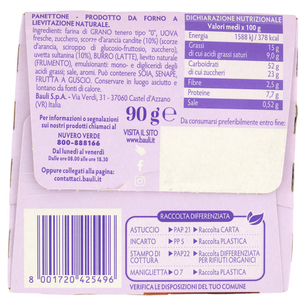 Farina di grano tenero tipo "0" Uova fresche Zucchero Scorze d'arancia candite (10%) (scorze d'arancia, sciroppo di glucosio-fruttosio, zucchero) Uvetta sultanina (10%) Burro (latte) Lievito naturale (frumento) Emulsionanti: mono- e digliceridi degli acidi grassi Sale Aromi Può contenere soia, senape, frutta a guscio
