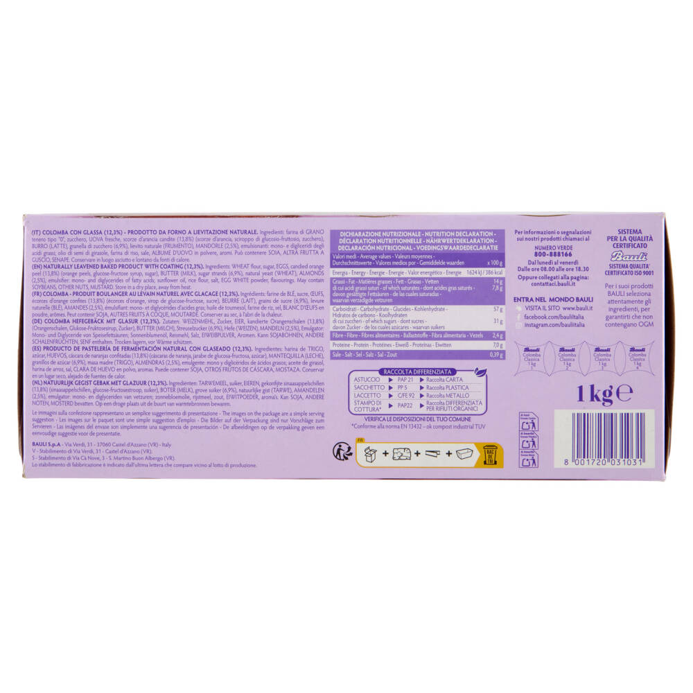 Farina di grano tenero tipo "0" Zucchero Uova fresche Scorze d'arancia candite (13,8%) (scorze d'arancia, sciroppo di glucosio-fruttosio, zucchero) Burro (latte) Granella di zucchero (6,9%) Lievito naturale (frumento) Mandorle (2,5%) Emulsionanti: mono- e digliceridi degli acidi grassi Olio di semi di girasole Farina di riso Sale Albume d'uovo in polvere Aromi Può contenere soia, altra frutta a guscio, senape