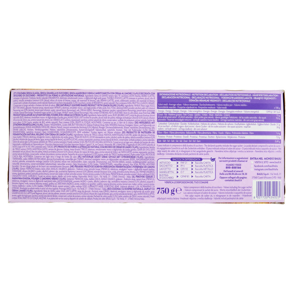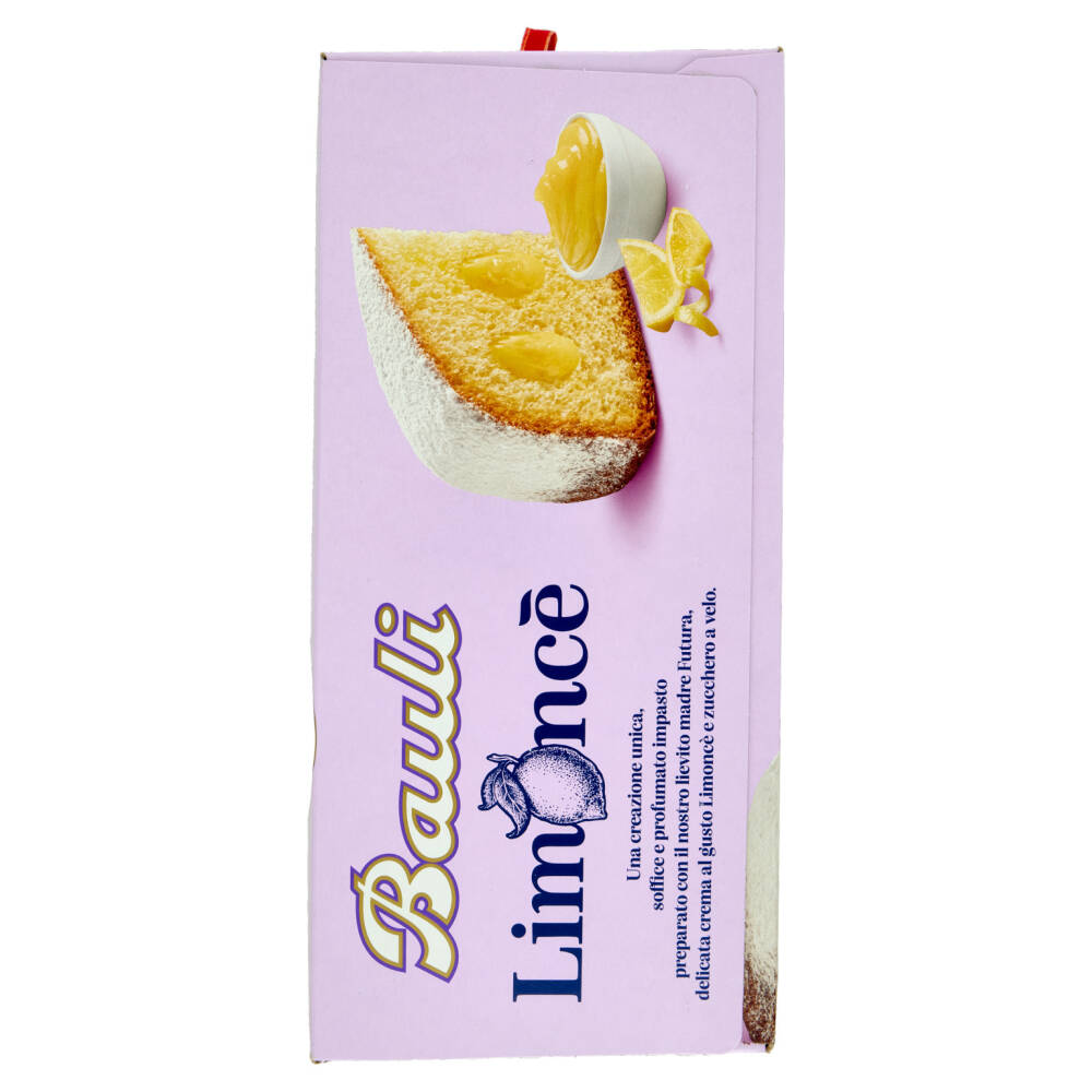 Farina di grano tenero tipo "0" Zucchero Uova fresche Burro (latte) Sciroppo di glucosio- fruttosio Lievito naturale (frumento) Destrosio Emulsionanti: mono- e digliceridi degli acidi grassi Tuorlo d'uovo Latte scremato in polvere Alcool Olio di palma Miscela aromatica Limoncè 0,5% [alcool, infuso di scorze di limone, acqua, olii essenziali di limone] Sale Panna (latte) Aromi Addensanti: pectine Olii essenziali di limone Conservanti: sorbato di potassio Aromi naturali Bustina di zucchero impalpabile (3,2%) [zucchero, amido di frumento, aromi naturali] Può contenere soia, frutta a guscio, senape