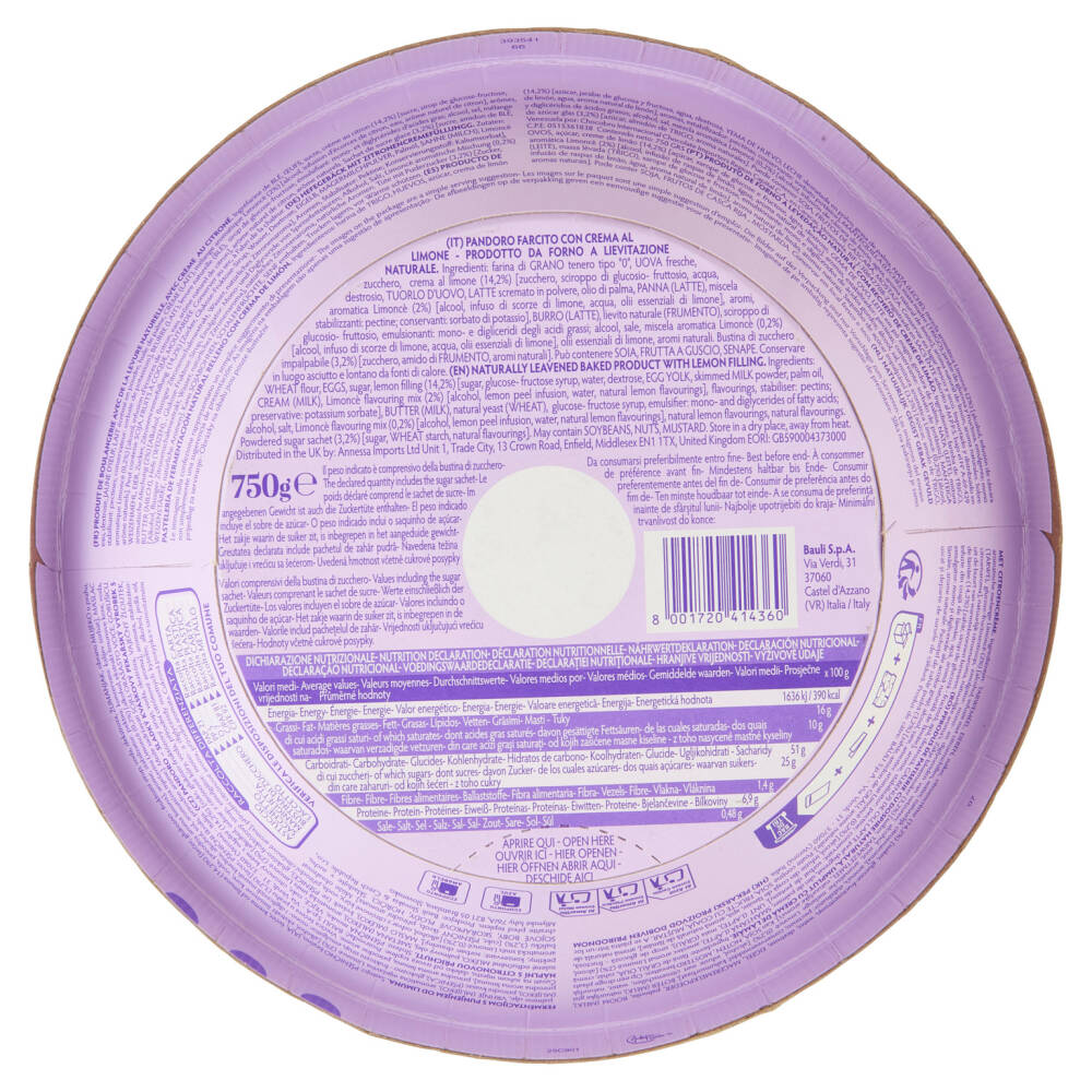Crema al limone (14,2%) [zucchero, sciroppo di glucosio- fruttosio, acqua, destrosio, tuorlo d'uovo, latte scremato in polvere, olio di palma, panna (latte), miscela aromatica Limoncè (2%) [alcool, infuso di scorze di limone, acqua, olii essenziali di limone], aromi, stabilizzanti: pectine; conservanti: sorbato di potassio]