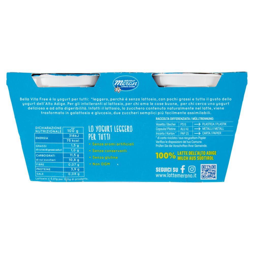 Bella Vita Free è lo yogurt per tutti: *leggero, perché è senza lattosio, con pochi grassi e tutto il gusto dello yogurt dell'Alto Adige. Per gli intolleranti al lattosio, per chi ama le cose buone, per chi cerca uno yogurt delizioso e ad alta digeribilità. Infatti il lattosio, lo zucchero contenuto naturalmente nel latte, viene trasformato in galattosio e glucosio, due zuccheri semplici più facilmente assimilabili.