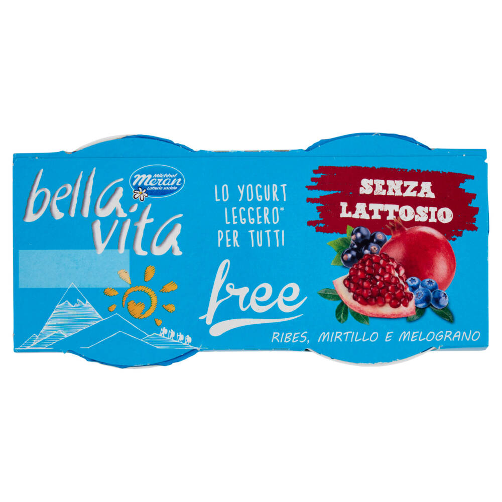 Yogurt (latte parzialmente scremato senza lattosio, fermenti lattici dello yogurt: Streptococcus thermophilus e Lactobacillus bulgaricus) Preparazione di frutta (frutta 6% (di cui ribes nero 3%, mirtillo nero 1,7% e melograno 1,3%) sul totale del prodotto finito; zucchero, amido modificato di mais, aromi naturali, succo di sambuco da concentrato, correttore di acidità: acido citrico) Zucchero Senza glutine