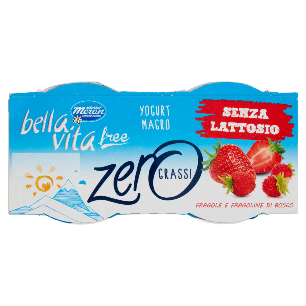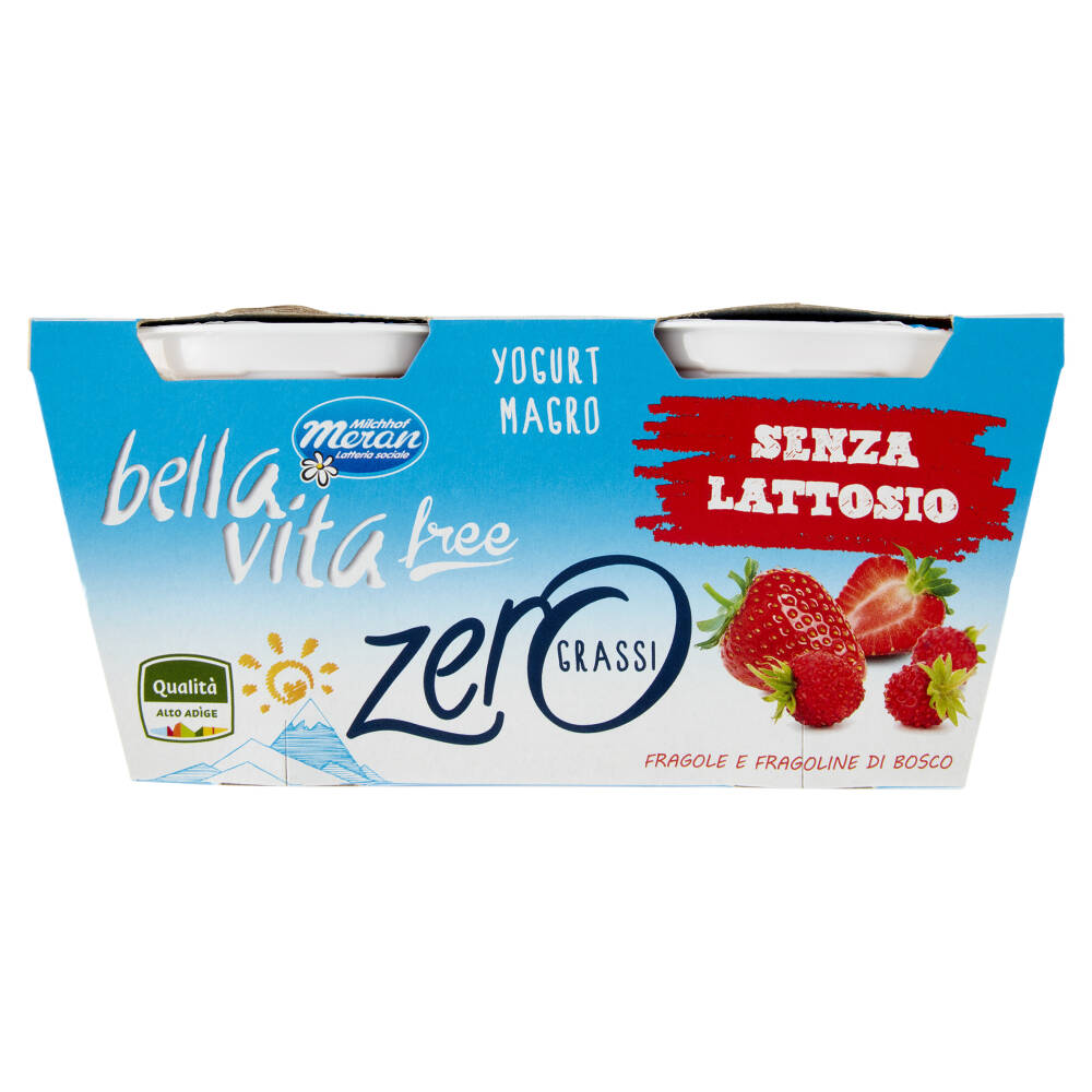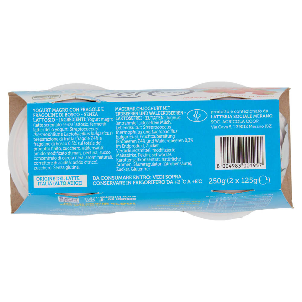 Yogurt magro (latte scremato senza lattosio, fermenti lattici dello yogurt: Streptococcus thermophilus e Lactobacillus bulgaricus) Preparazione di frutta (fragole 7,4% e fragoline di bosco 0,3% sul totale del prodotto finito, zucchero, addensanti: amido modificato di mais, pectina; succo concentrato di carota nera, aromi naturali, correttore di acidità: acido citrico) Zucchero Senza glutine