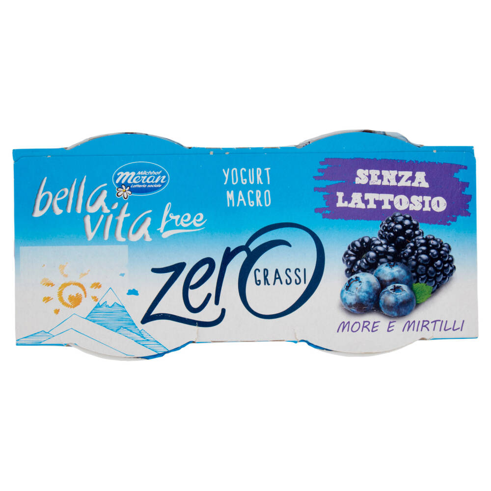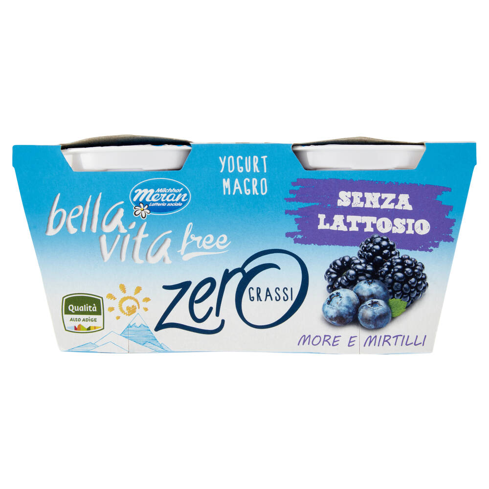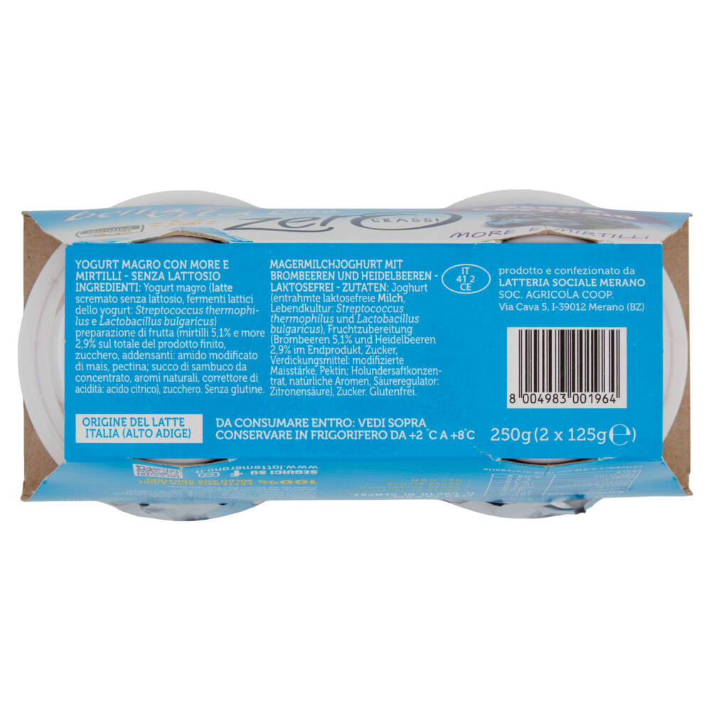 Yogurt magro (latte scremato senza lattosio, fermenti lattici dello yogurt: Streptococcus thermophilus e Lactobacillus bulgaricus) Preparazione di frutta (mirtilli 5,1% e more 2,9% sul totale del prodotto finito, zucchero, addensanti: amido modificato di mais, pectina; succo di sambuco da concentrato, aromi naturali, correttore di acidità: acido citrico) Zucchero Senza glutine
