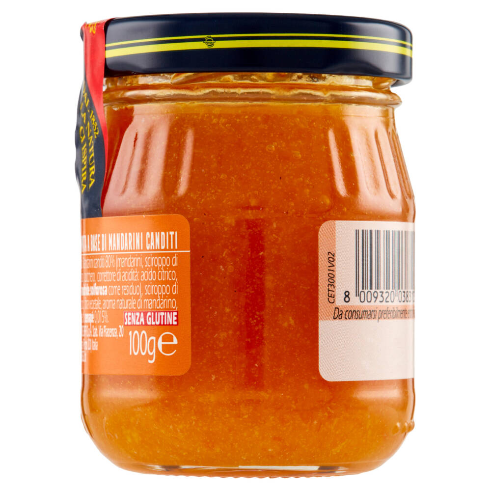 Mandarini canditi 80% (mandarini, sciroppo di glucosio-fruttosio, zucchero, correttore di acidità: acido citrico, conservante: anidride solforosa come residuo) Sciroppo di glucosio-fruttosio Fibra vegetale Aroma naturale di mandarino Aroma naturale di senape 0,015% SENZA GLUTINE