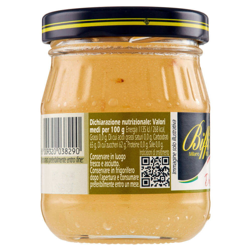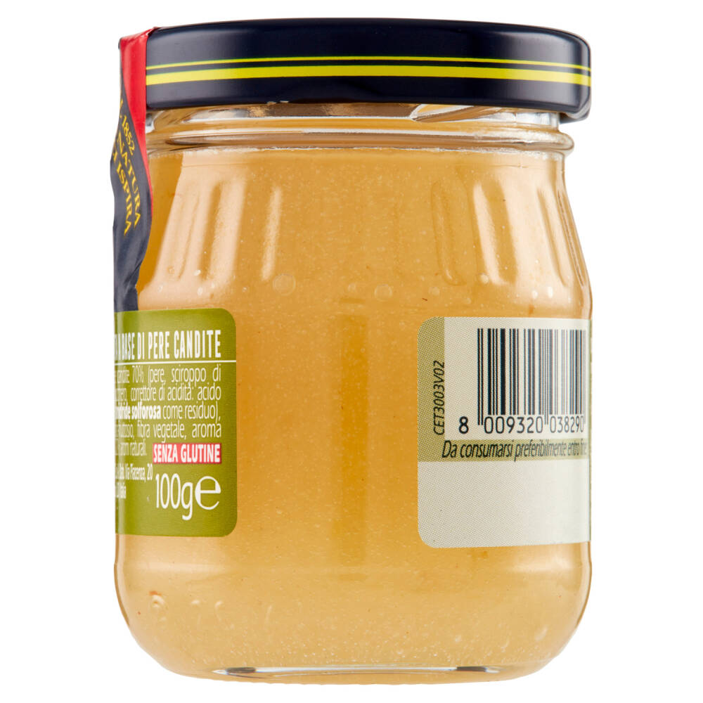 Pere candite 70% (pere, sciroppo di glucosio-fruttosio, zucchero, correttore di acidità: acido citrico, conservante: anidride solforosa come residuo) Sciroppo di glucosio-fruttosio Fibra vegetale Aroma naturale di senape 0,02% Aromi naturali SENZA GLUTINE