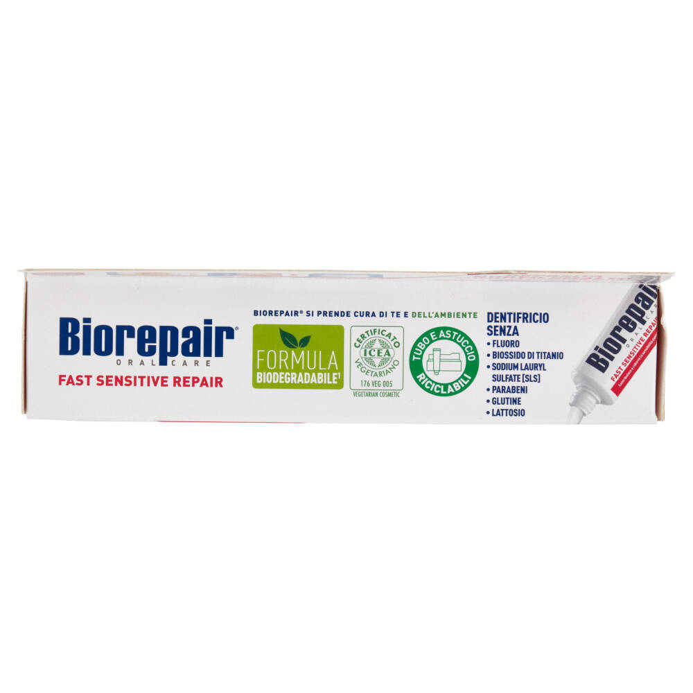 - Biorepair Fast Sensitive Repair grazie alla sua formula potenziata con ancora più microRepair, ripara lo smalto legandosi spontaneamente ad esso, riparando le micro scalfitture e impedendo agli stimoli termici di raggiungere il nervo del dente, causa di fastidi e fitte.