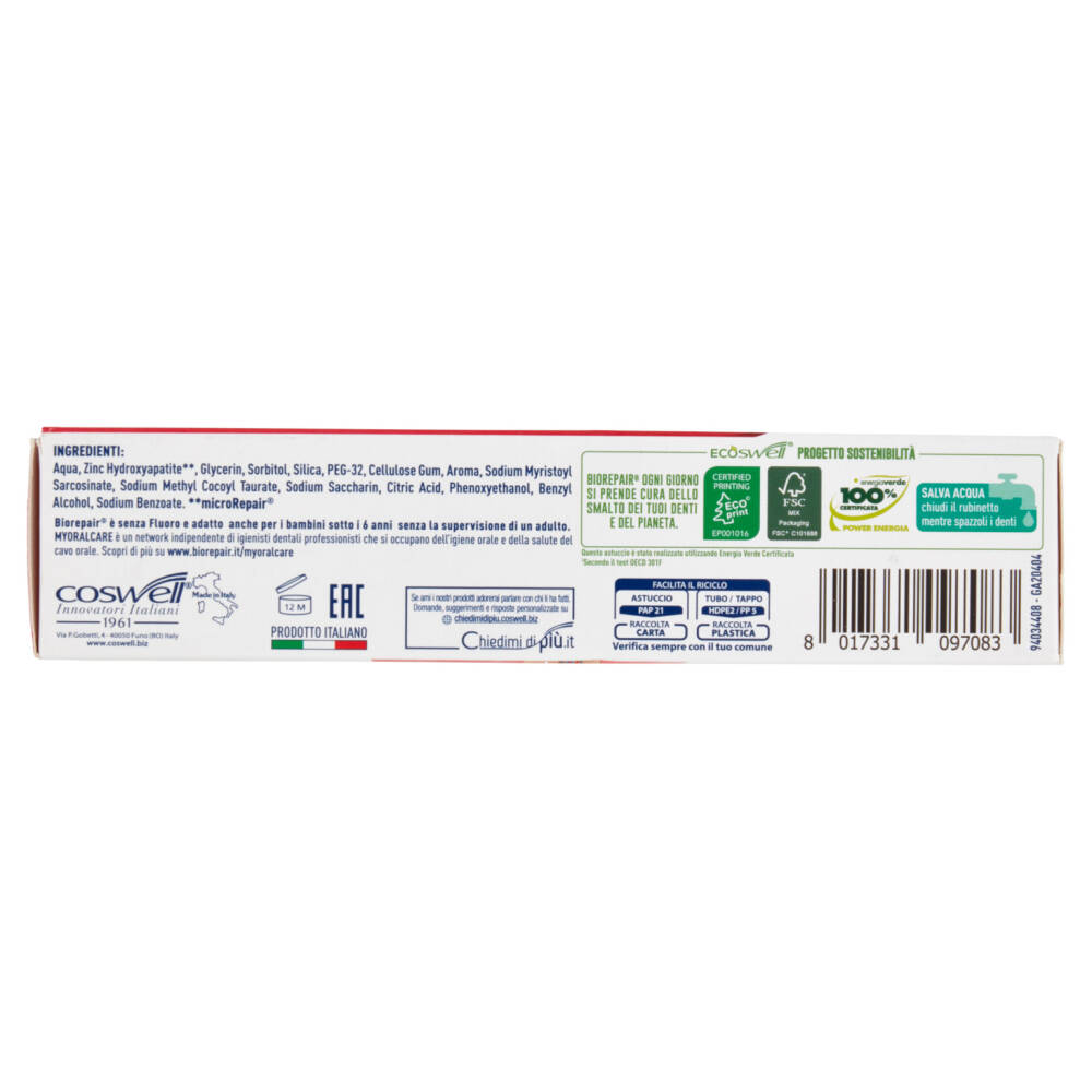 Biorepair è l'unico dentifricio con microRepair brevettato che deposita nuovo smalto su tutta la superficie dei denti con l'uso quotidiano*. I microRepair come un guanto avvolgono i denti, riparandoli* e proteggendoli da carie e placca. Sviluppati dalla ricerca italiana dei laboratori Coswell in collaborazione con l'Università di Bologna, i microRepair sono particelle di idrossiapatite biomimetica, la stessa sostanza dello smalto naturale dei nostri denti, per questo si legano spontaneamente alla loro superficie rendendola omogenea, resistente e duratura. Inoltre liberano Zinco dalle note proprietà antibatteriche.
