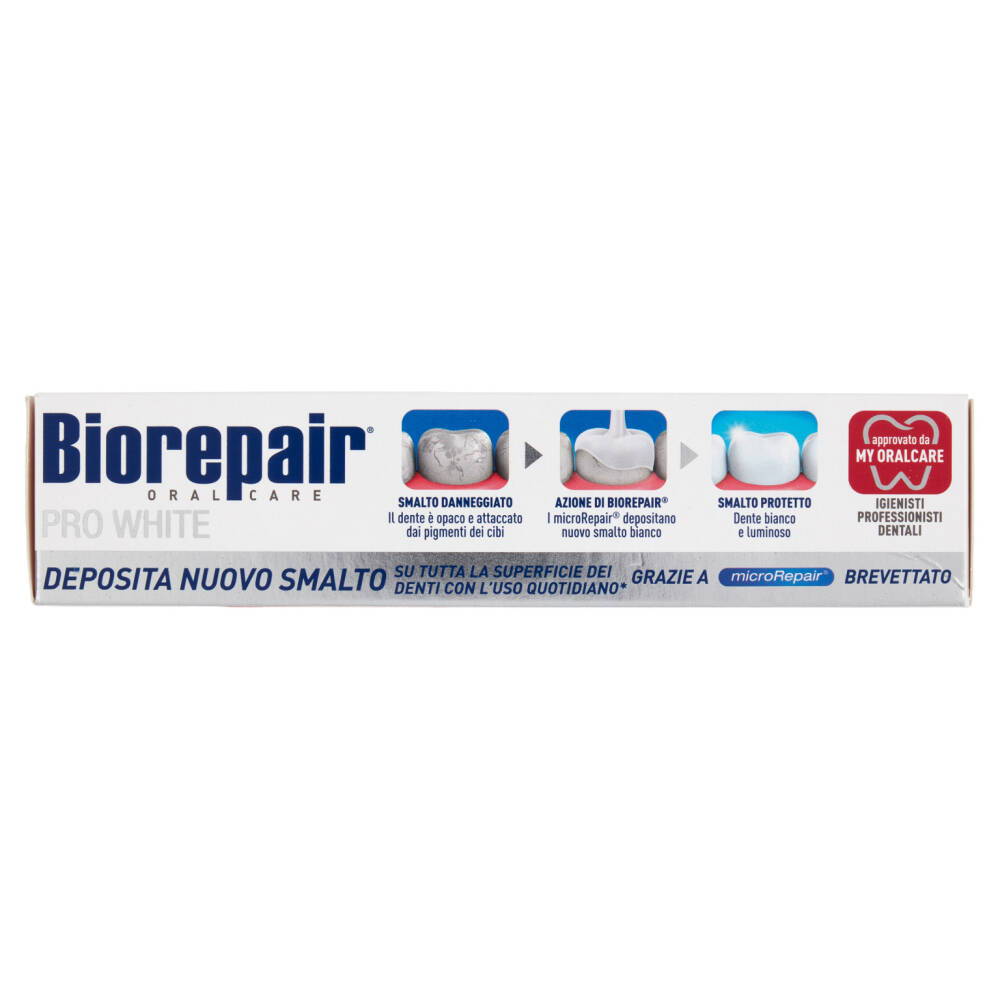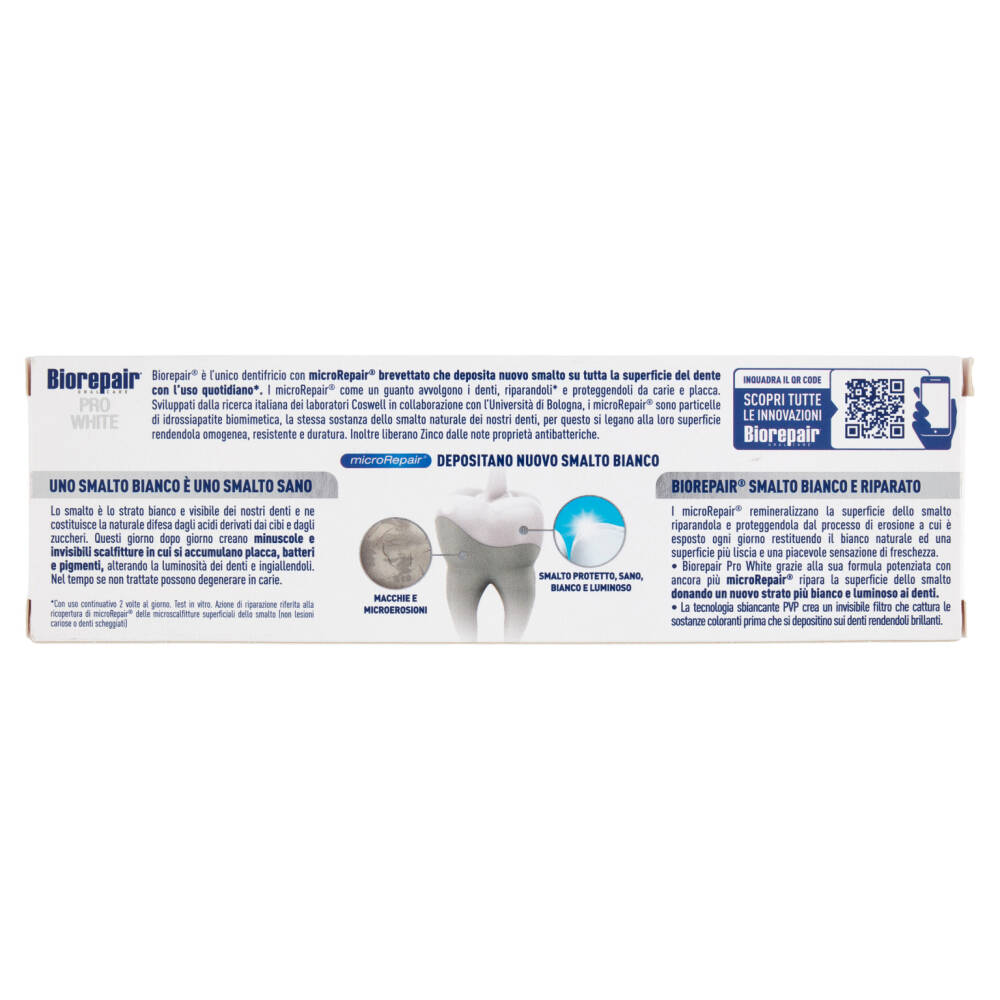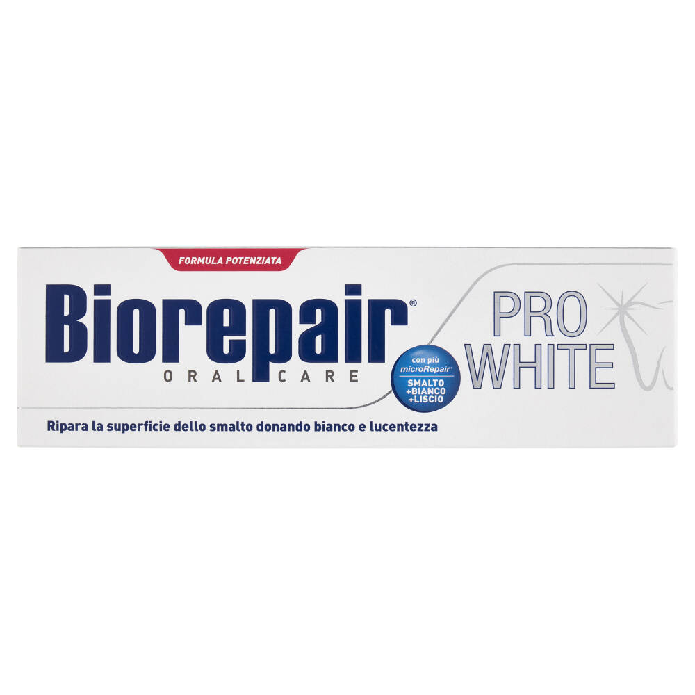 - Biorepair Pro White grazie alla sua formula potenziata con ancora più microRepair ripara la superficie dello smalto donando un nuovo strato più bianco e luminoso ai denti.