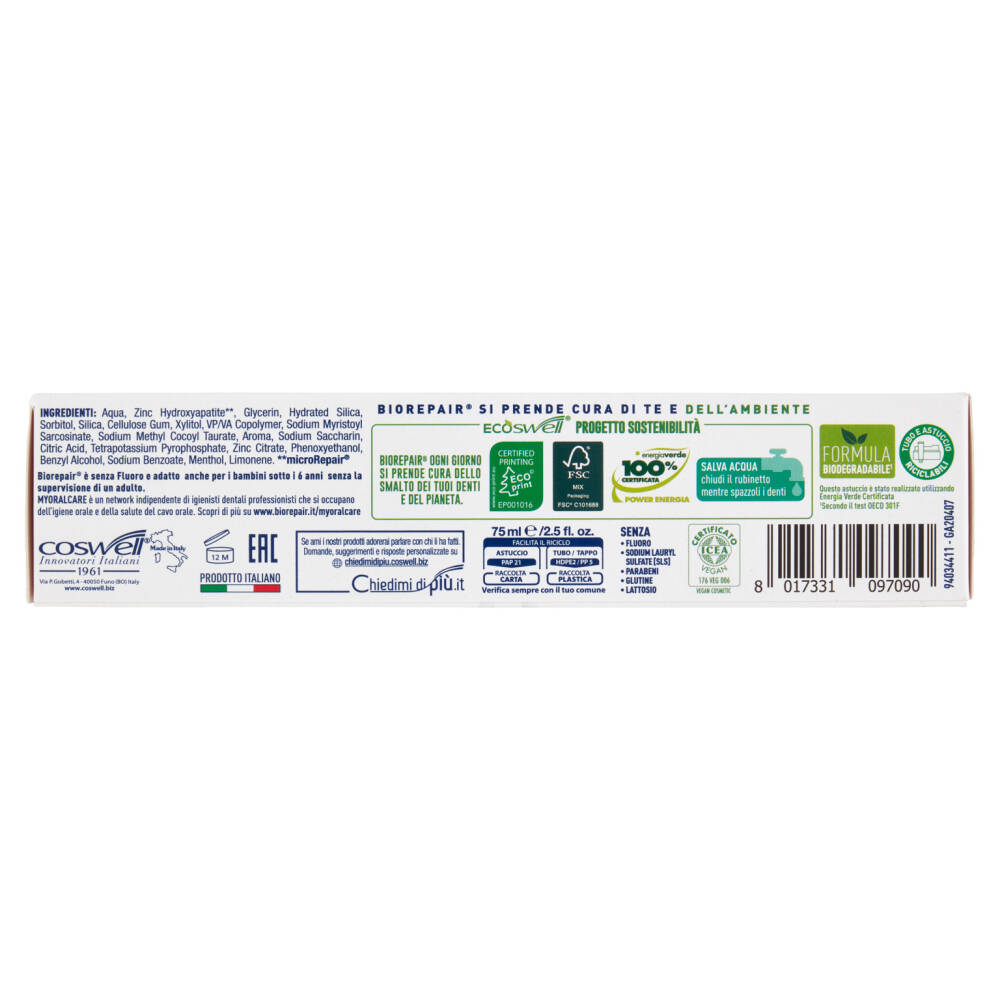 Biorepair è l'unico dentifricio con microRepair brevettato che deposita nuovo smalto su tutta la superficie del dente con l'uso quotidiano*. I microRepair come un guanto avvolgono i denti, riparandoli* e proteggendoli da carie e placca. Sviluppati dalla ricerca italiana dei laboratori Coswell in collaborazione con l'Università di Bologna, i microRepair sono particelle di idrossiapatite biomimetica, la stessa sostanza dello smalto naturale dei nostri denti, per questo si legano alla loro superficie rendendola omogenea, resistente e duratura. Inoltre liberano Zinco dalle note proprietà antibatteriche.