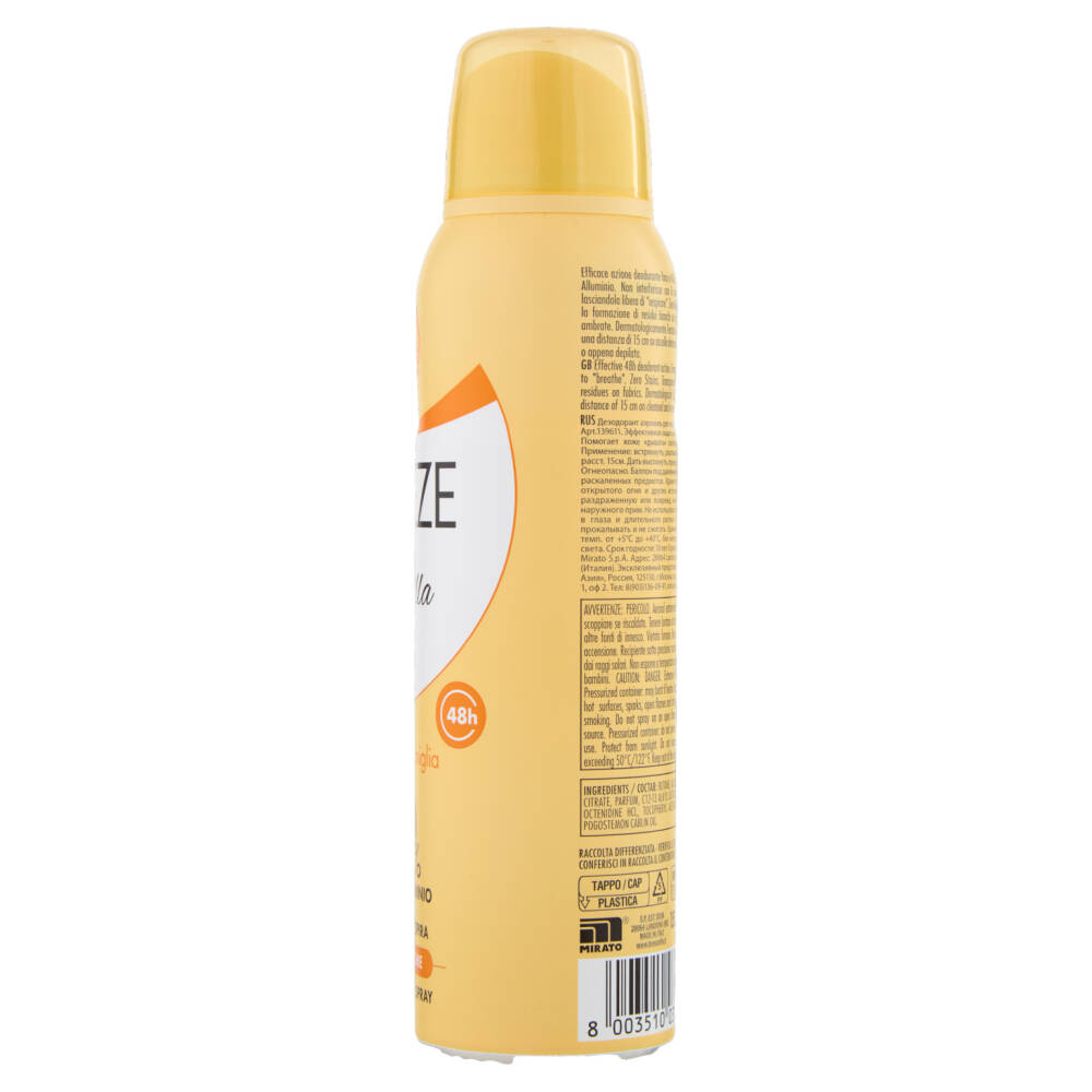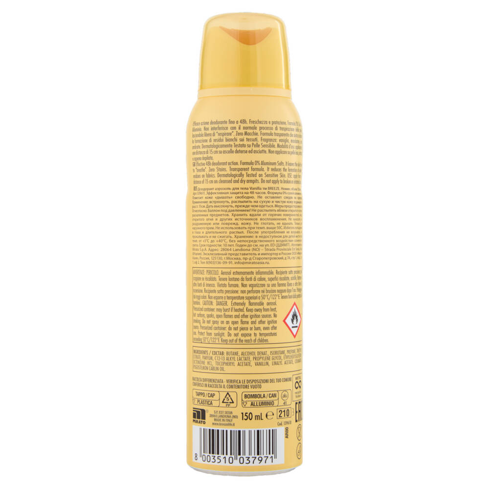 Efficace azione deodorante fino a 48h. Freschezza e protezione. Formula 0% Sali di Alluminio. Non interferisce con il normale processo di traspirazione della pelle, lasciandola libera di "respirare". Zero Macchie. Formula trasparente che aiuta a ridurre la formazione di residui bianchi sui tessuti. Fragranza: vaniglia, mandarino, note ambrate. Dermatologicamente Testato su Pelle Sensibile.