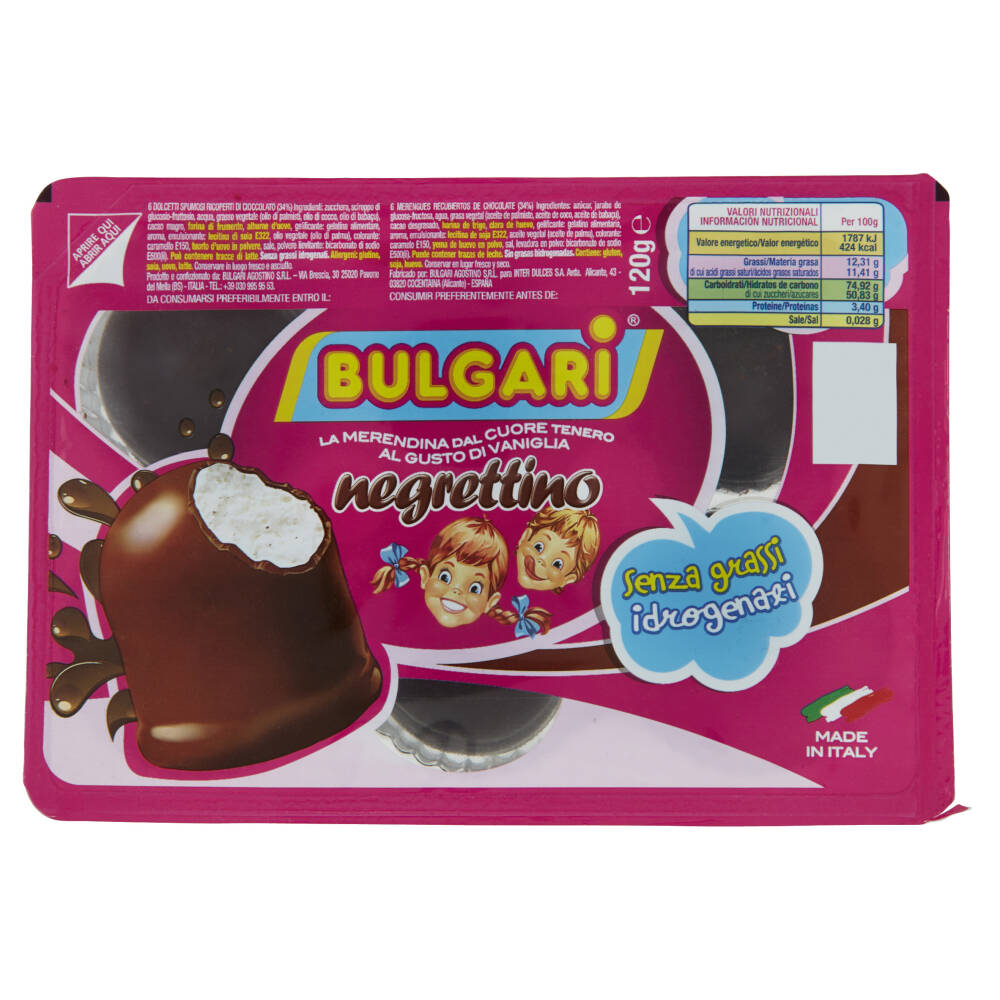 Zucchero Sciroppo di glucosio-fruttosio Acqua Grasso vegetale (olio di cocco, burro di cacao) Cacao magro Farina di frumento Albume d'uovo Gelificante: gelatina alimentare Aroma Emulsionante: lecitina di soia E322 Olio vegetale (olio di girasole alto oleico) Sciroppo di zucchero caramellato Tuorlo d'uovo in polvere Sale Polvere lievitante: bicarbonato di sodio E500 (ii) Può contenere tracce di latte Allergeni: glutine, soia, uovo, latte