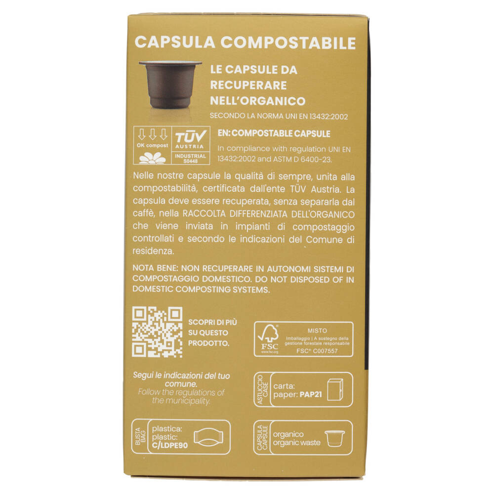 Nelle nostre capsule la qualità di sempre, unita alla compostabilità, certificata dall'ente TÜV Austria. La capsula deve essere recuperata, senza separarla dal caffè, nella Raccolta Differenziata dell'Organico che viene inviata in impianti di compostaggio controllati e secondo le indicazioni del Comune di residenza.