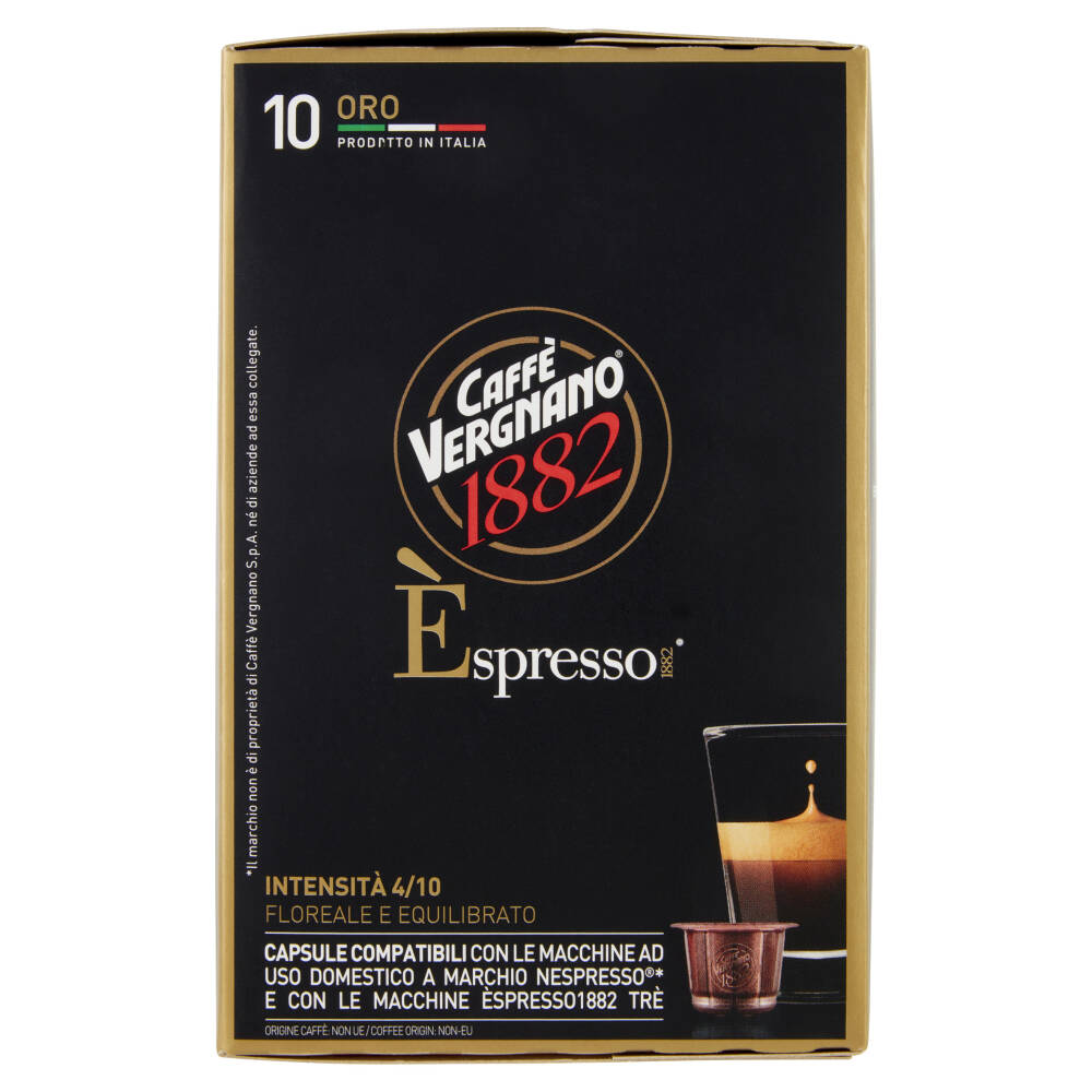 Prodotto in Italia Intensità 4/10 Floreale e equilibrato Capsule compatibili con le macchine ad uso domestico a marchio Nespresso* e con le macchine Èspresso1882 Trè Origine caffè: non UE *Il marchio non è di proprietà di Caffè Vergnano S.p.A. né di aziende ad essa collegate
