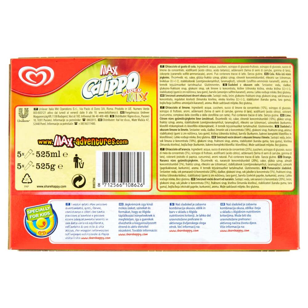 I nostri gelati Max uniscono divertimento, gusti, forme, consistenze e colori che tanto piacciono ai bambini e possono essere adeguatamente inseriti in una dieta varia ed equilibrata, nell'ambito di uno stile di vita attivo. Per maggiori informazioni sull'impegno nutrizionale di Algida visita il sito www.sharehappy.com
